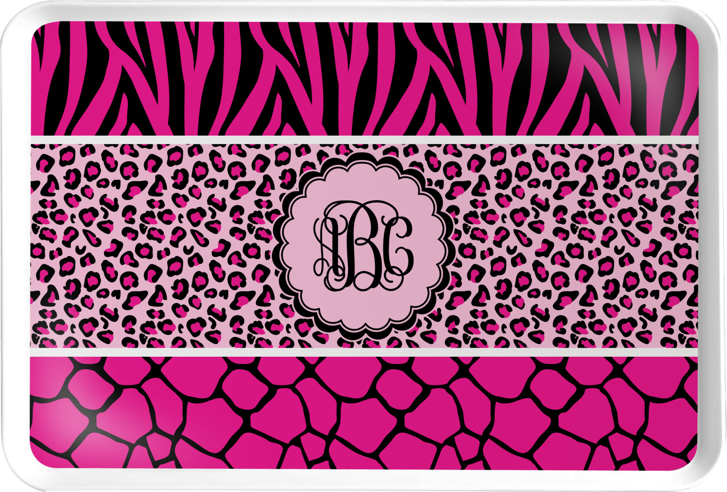 This over top triple animal prints (zebra, leopard & giraffe) is definitely for the person who LOVES animal prints. The design has zebra print on top, leopard print in the middle and giraffe print on the bottom. We chose to feature this design in black, hot pink and baby pink, however, the design is completely re-color-able, so you are able to select any color combinations you desire. Also the order of the pattern is also customizable.