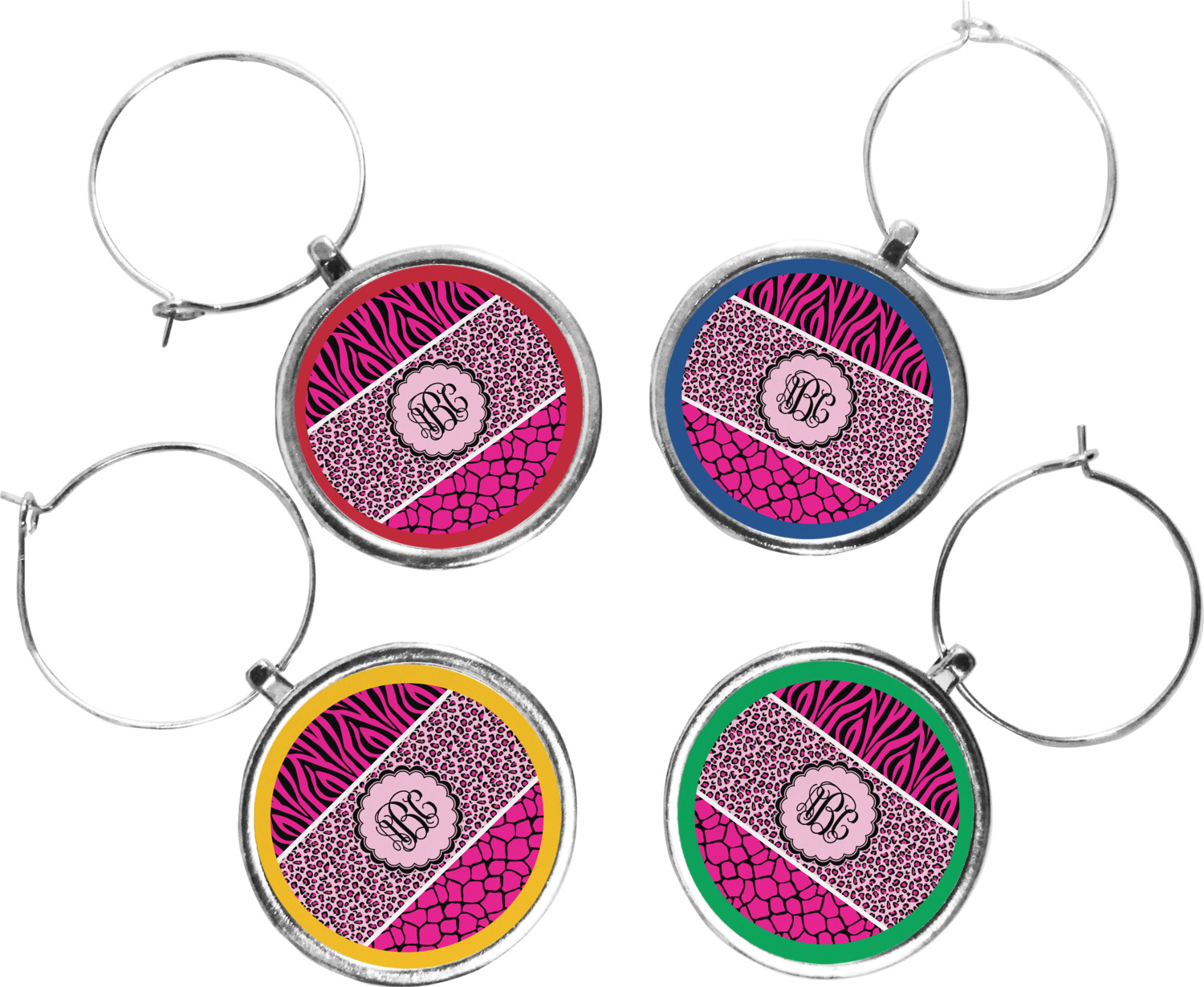 Your wine glass markers are comprised of a circular zinc plate with a 1.25 inch diameter. The zinc plate hangs from a zinc loop, which can be easily secured and removed from the stem of a wine glass. Your customized design is printed onto a 1 inch diameter insert, and then placed into the wine glass charm itself. Though sold in a set of four, you can personalize each charm individually and change the colors of the ring around your design, depending on your needs.