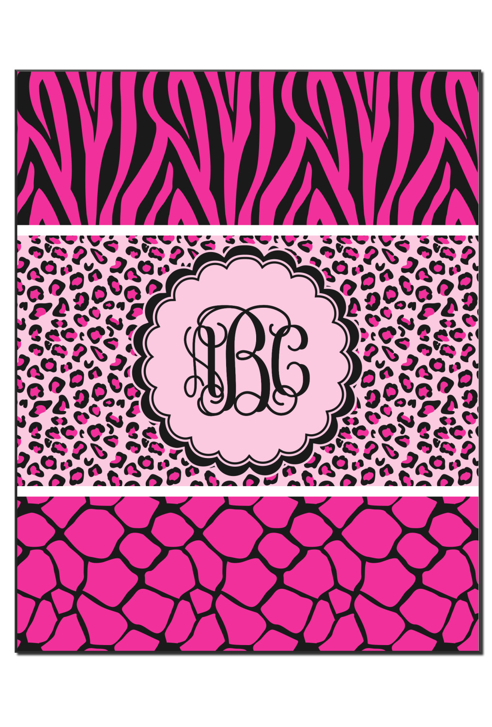 This over top triple animal prints (zebra, leopard & giraffe) is definitely for the person who LOVES animal prints. The design has zebra print on top, leopard print in the middle and giraffe print on the bottom. We chose to feature this design in black, hot pink and baby pink, however, the design is completely re-color-able, so you are able to select any color combinations you desire. Also the order of the pattern is also customizable.