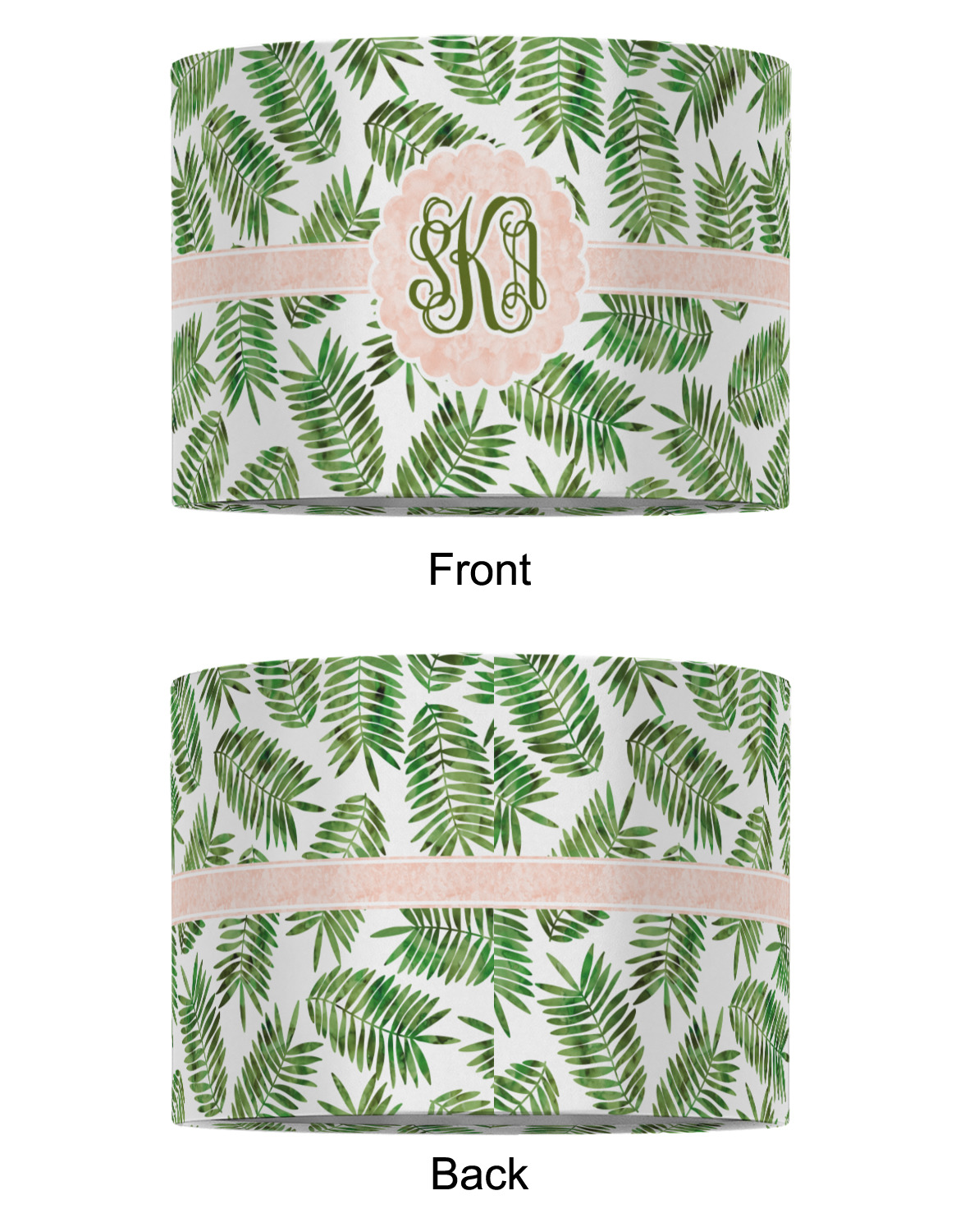 The background of the main design is filled with thin tropical leaves scattered about. The leaves are filled with a dark green watercolor texture. The ribbon and scalloped frame are filled with a light peach watercolor texture. The monogram in the middle gives an extra feminine touch to this design.