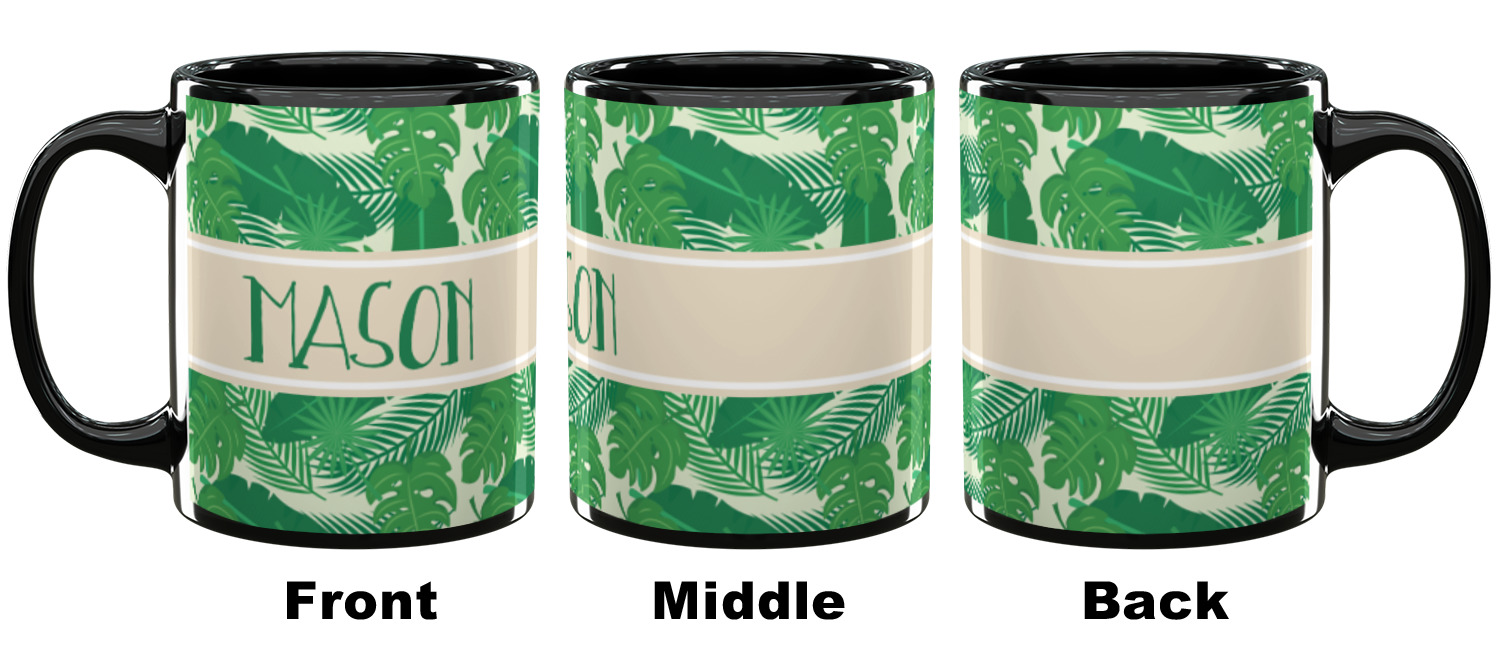 The main design has a cream background with bright green tropical leaves faces every which way. Through the middle of the design sits a cream ribbon, with your personalization on the ribbon itself. Several different kinds of tropical leaves are featured in this fun design.