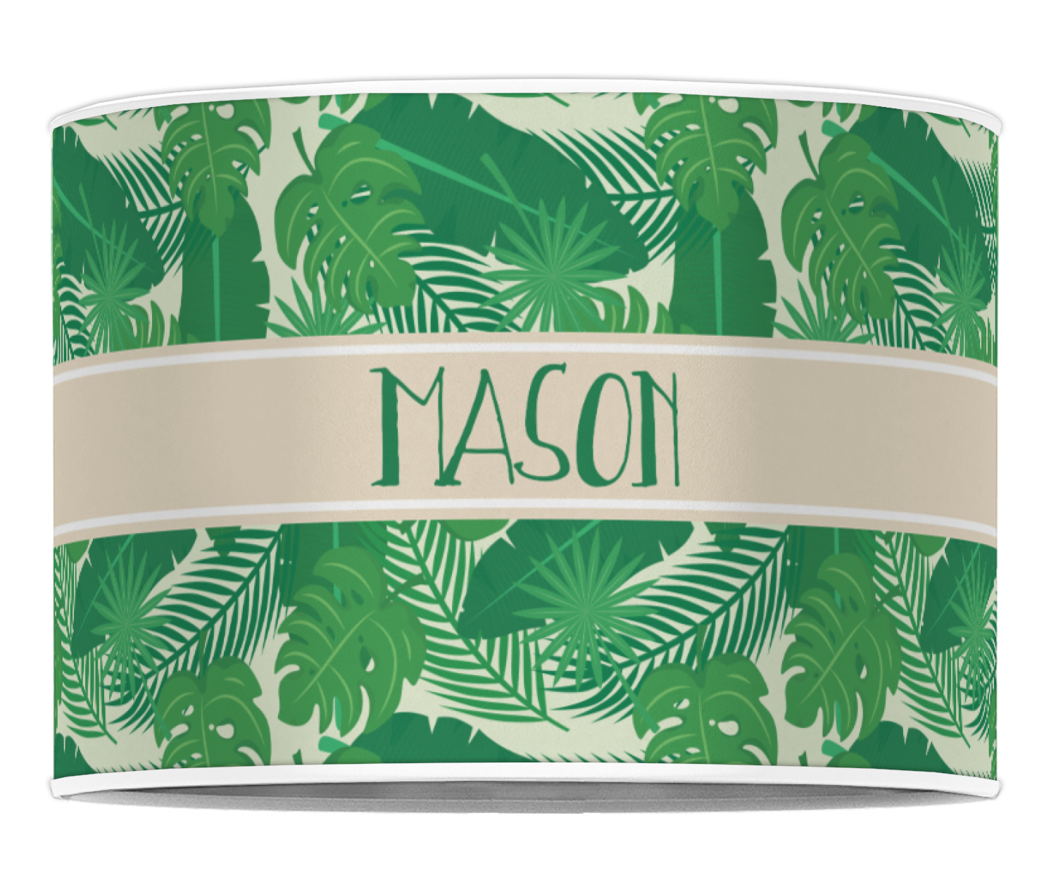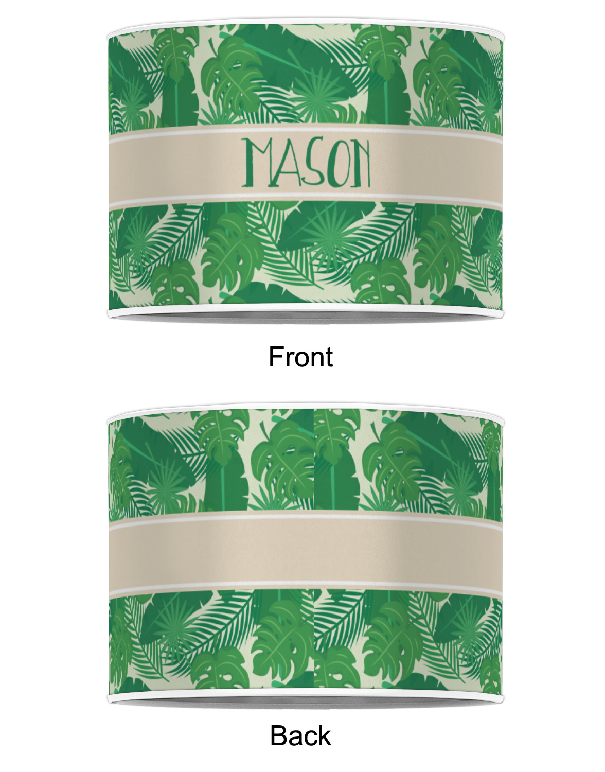 The main design has a cream background with bright green tropical leaves faces every which way. Through the middle of the design sits a cream ribbon, with your personalization on the ribbon itself. Several different kinds of tropical leaves are featured in this fun design.
