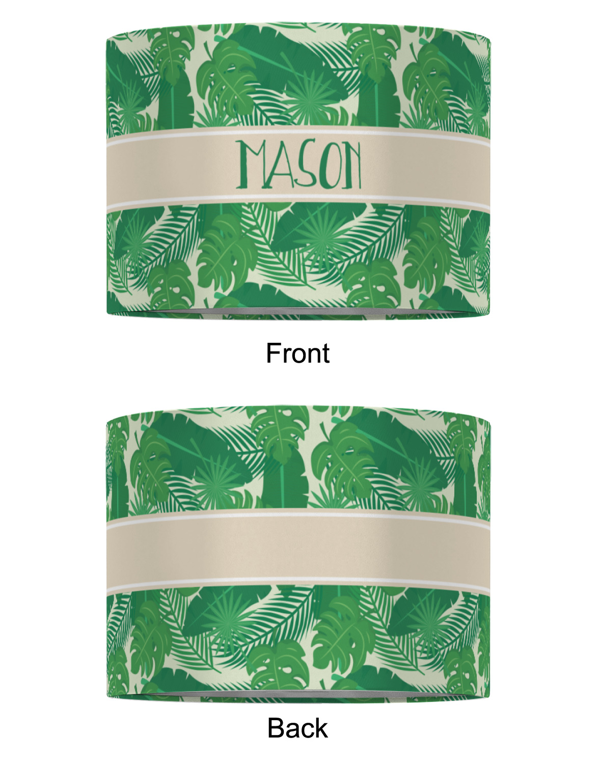 The main design has a cream background with bright green tropical leaves faces every which way. Through the middle of the design sits a cream ribbon, with your personalization on the ribbon itself. Several different kinds of tropical leaves are featured in this fun design.