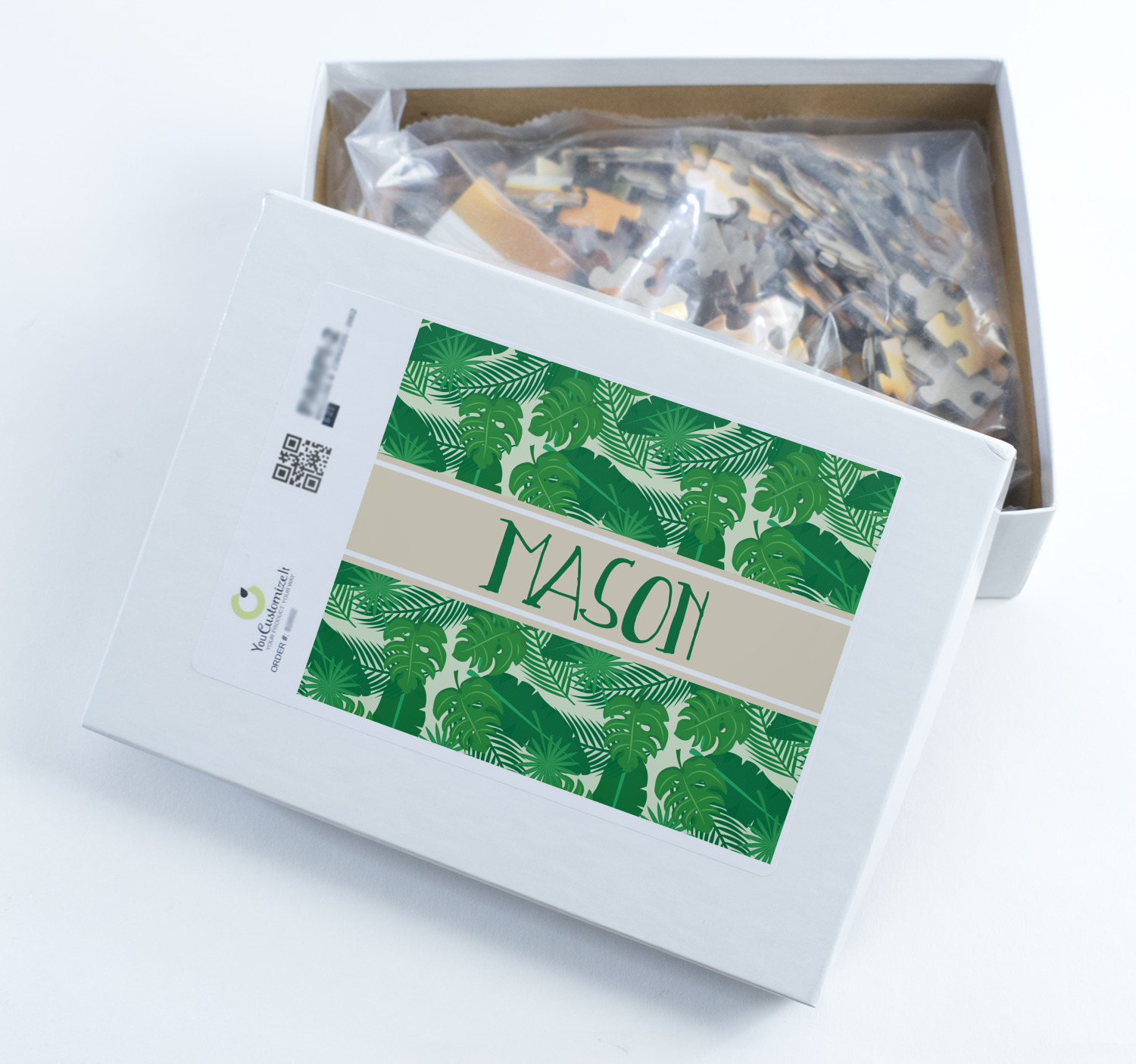 We print our puzzles on thick white chipboard in vibrant colors, then laminate the chipboard and die cut your puzzle. Your jigsaw puzzle is shipped to you in a box with the image of the puzzle on the box.
