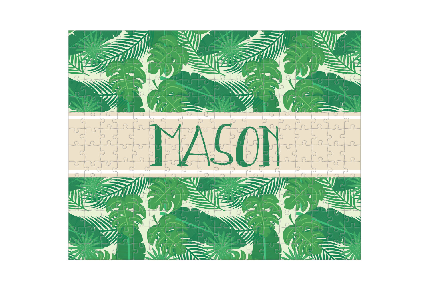 The main design has a cream background with bright green tropical leaves faces every which way. Through the middle of the design sits a cream ribbon, with your personalization on the ribbon itself. Several different kinds of tropical leaves are featured in this fun design.
