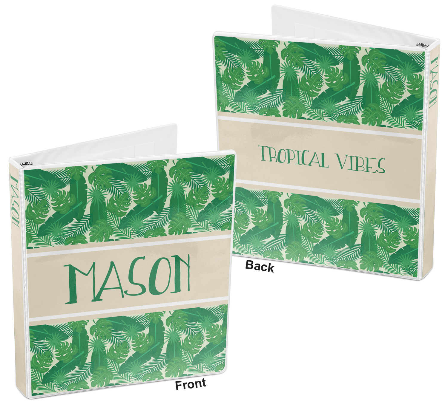 The main design has a cream background with bright green tropical leaves faces every which way. Through the middle of the design sits a cream ribbon, with your personalization on the ribbon itself. Several different kinds of tropical leaves are featured in this fun design.
