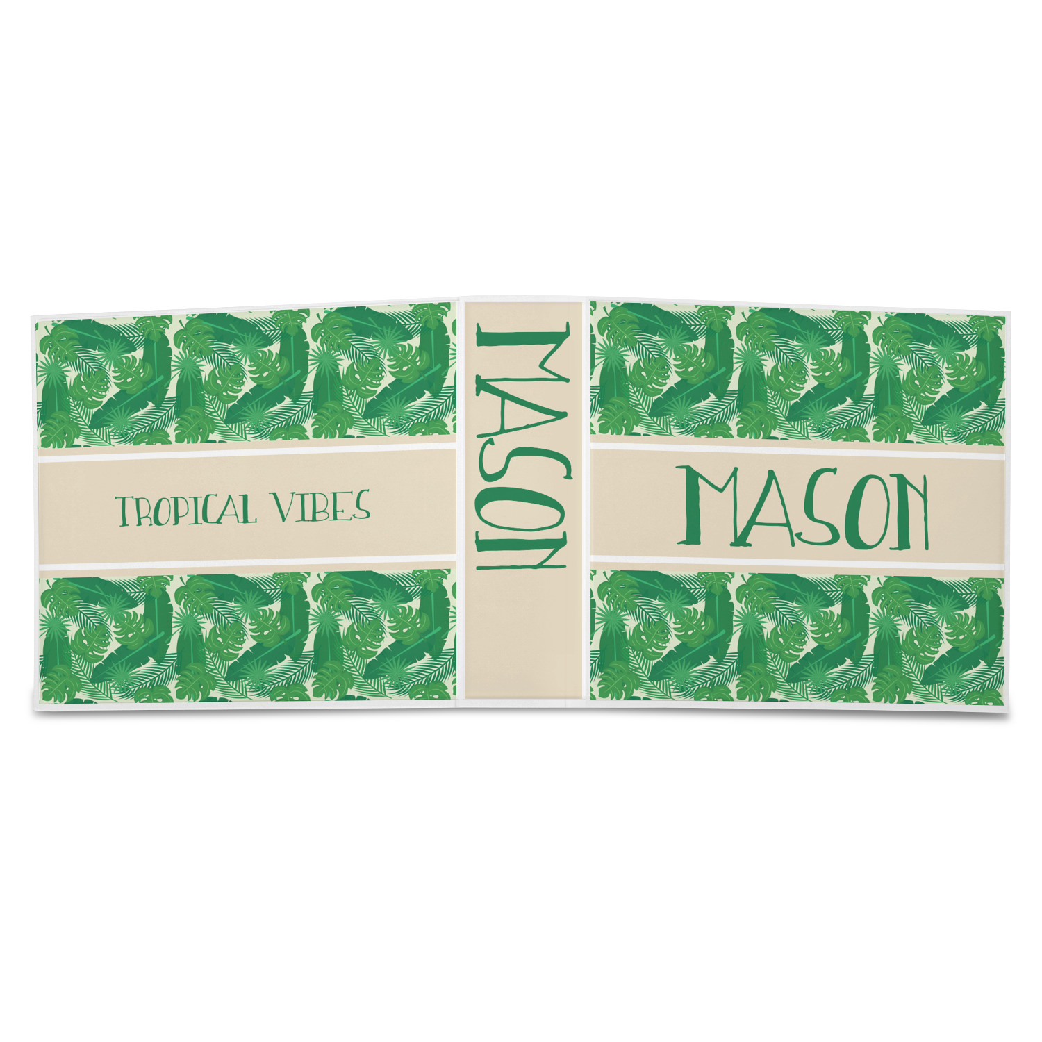 The main design has a cream background with bright green tropical leaves faces every which way. Through the middle of the design sits a cream ribbon, with your personalization on the ribbon itself. Several different kinds of tropical leaves are featured in this fun design.