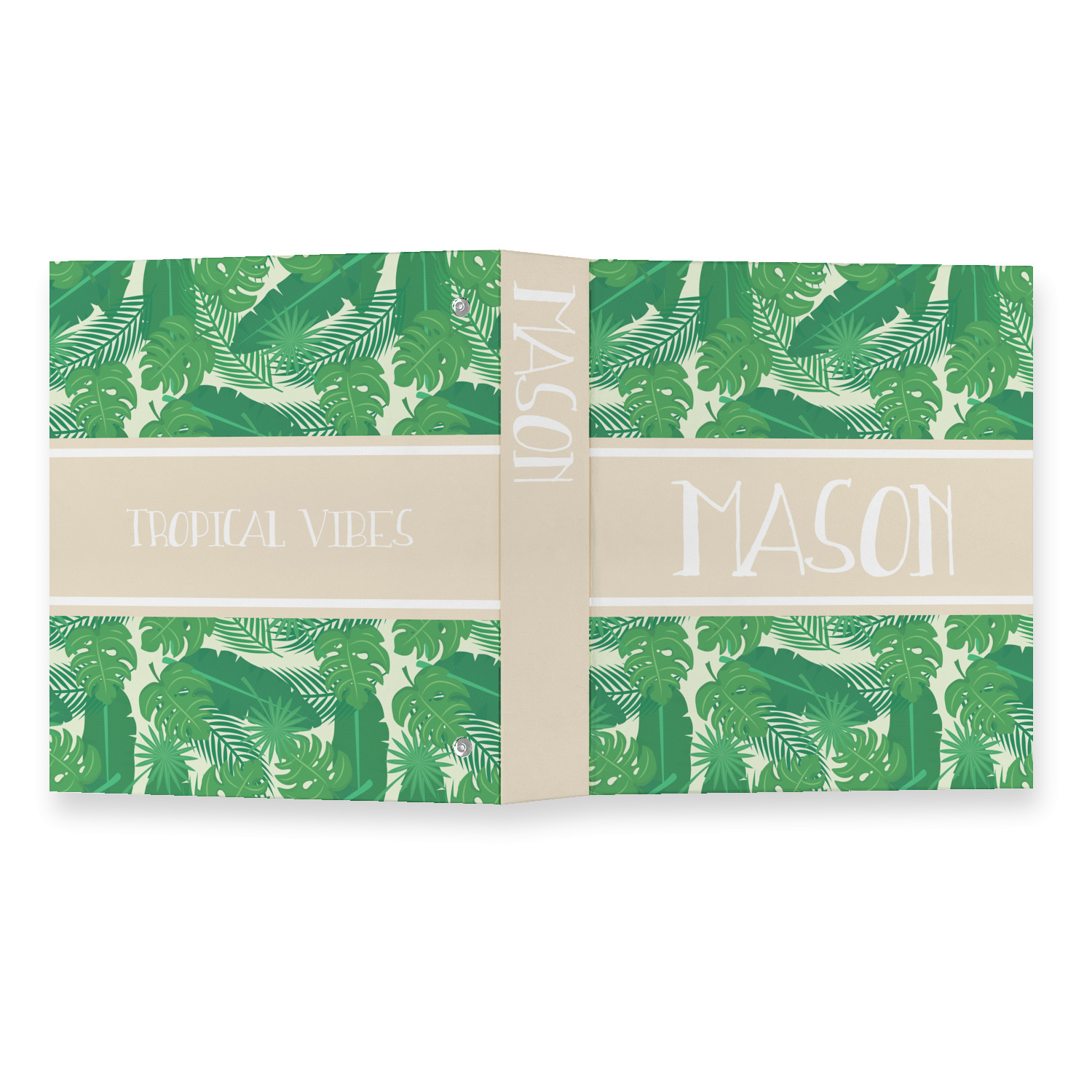 The main design has a cream background with bright green tropical leaves faces every which way. Through the middle of the design sits a cream ribbon, with your personalization on the ribbon itself. Several different kinds of tropical leaves are featured in this fun design.