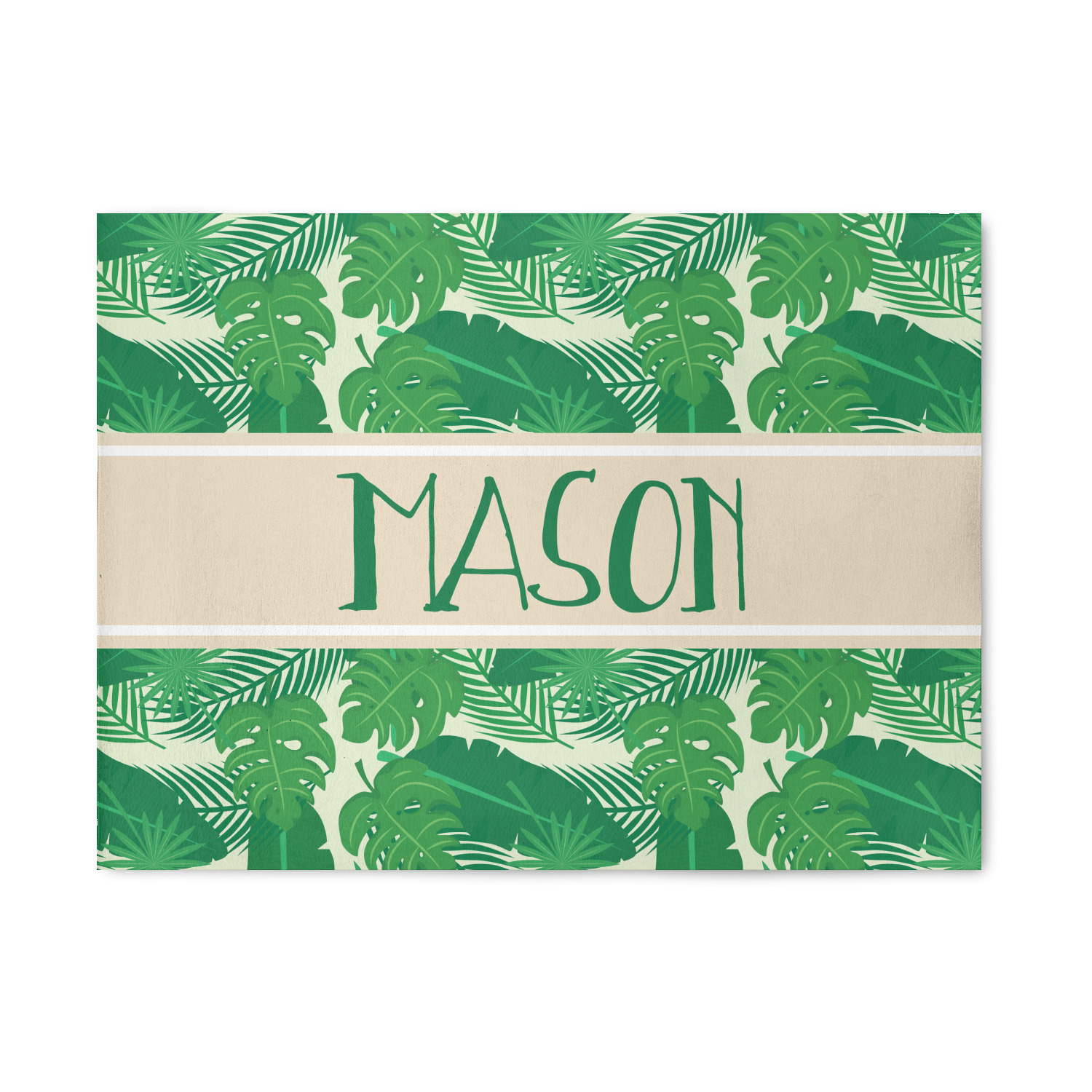 The main design has a cream background with bright green tropical leaves faces every which way. Through the middle of the design sits a cream ribbon, with your personalization on the ribbon itself. Several different kinds of tropical leaves are featured in this fun design.
