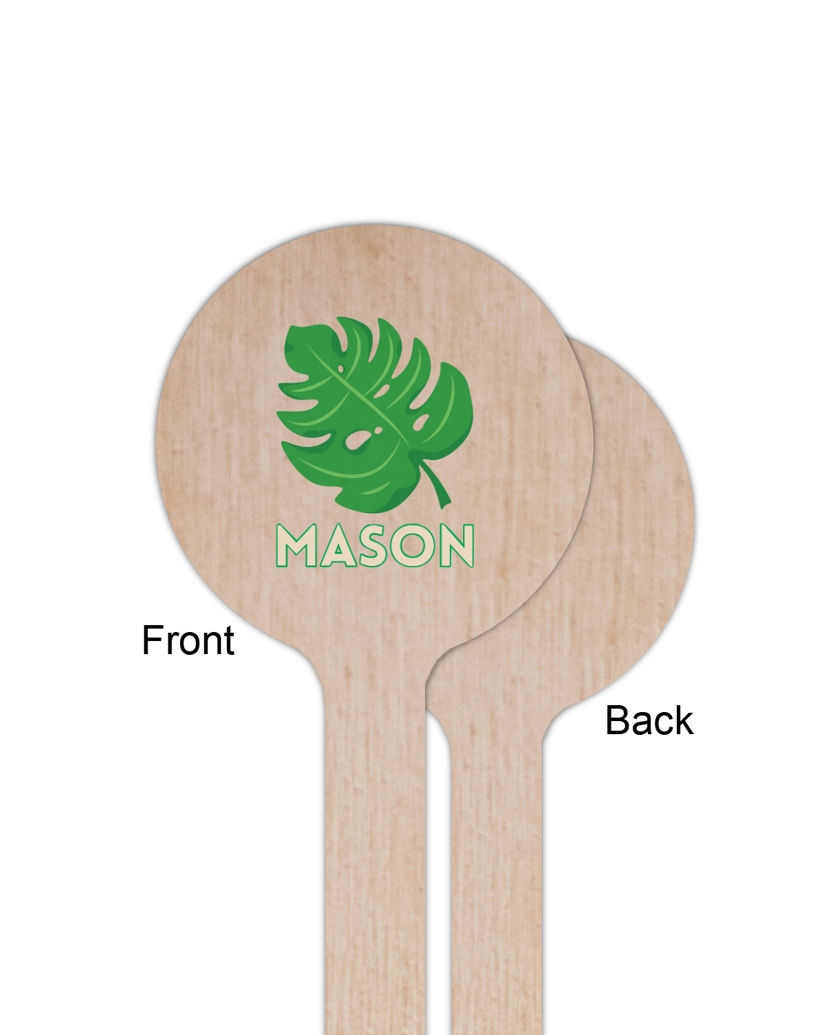The main design has a cream background with bright green tropical leaves faces every which way. Through the middle of the design sits a cream ribbon, with your personalization on the ribbon itself. Several different kinds of tropical leaves are featured in this fun design.