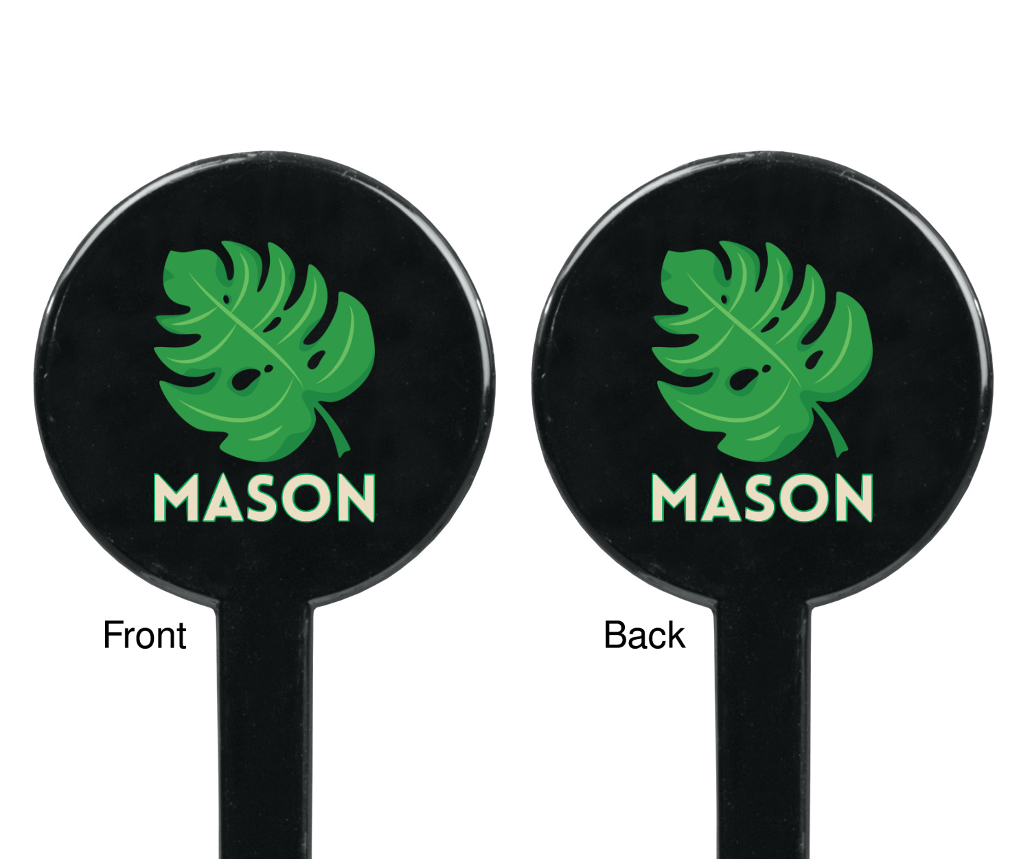 The main design has a cream background with bright green tropical leaves faces every which way. Through the middle of the design sits a cream ribbon, with your personalization on the ribbon itself. Several different kinds of tropical leaves are featured in this fun design.