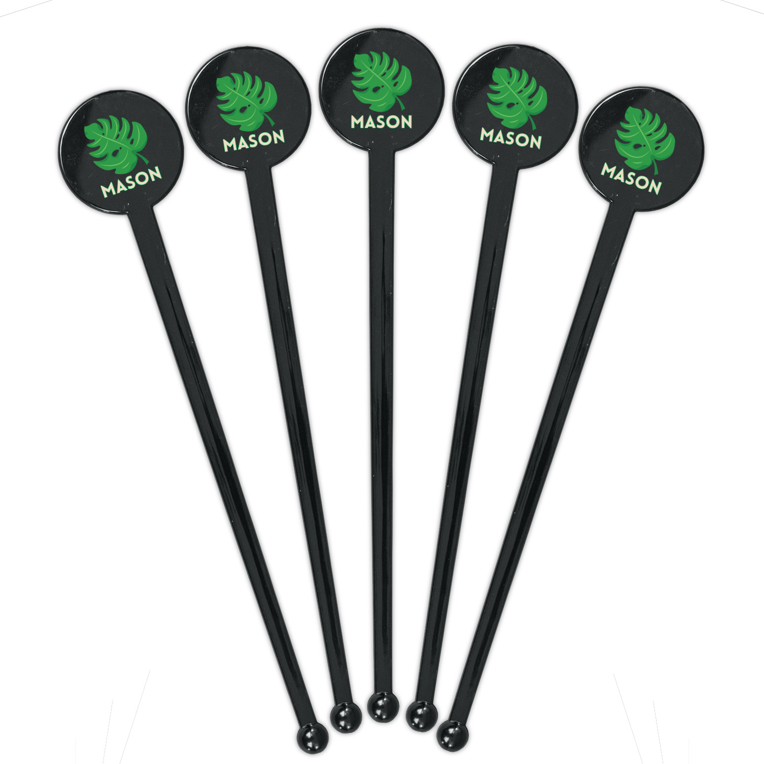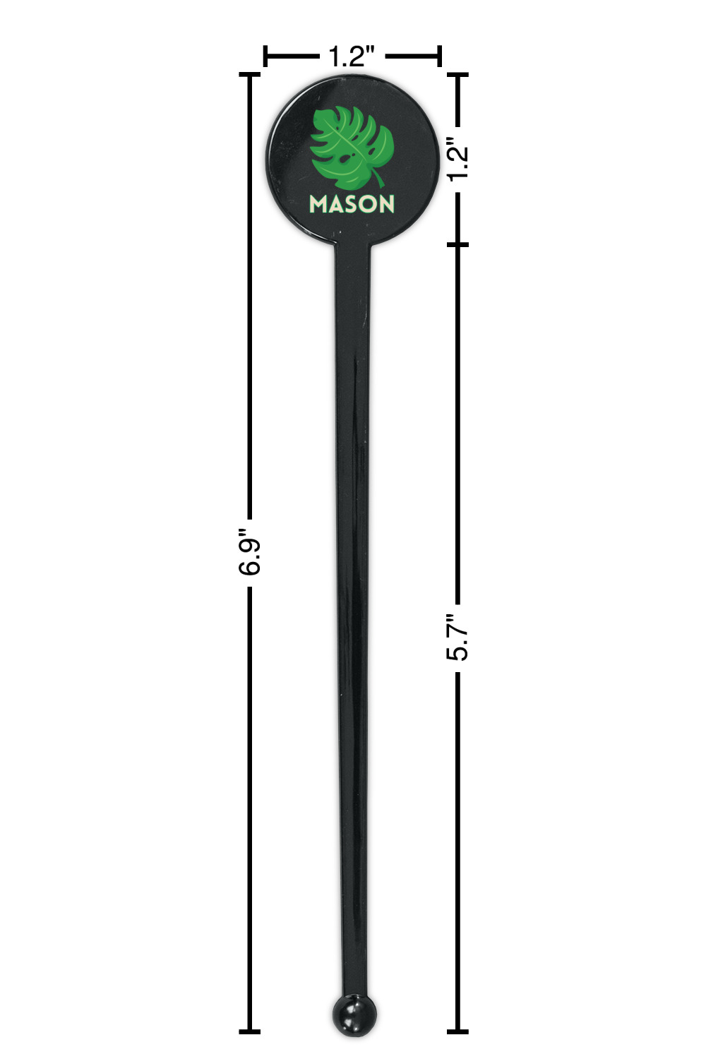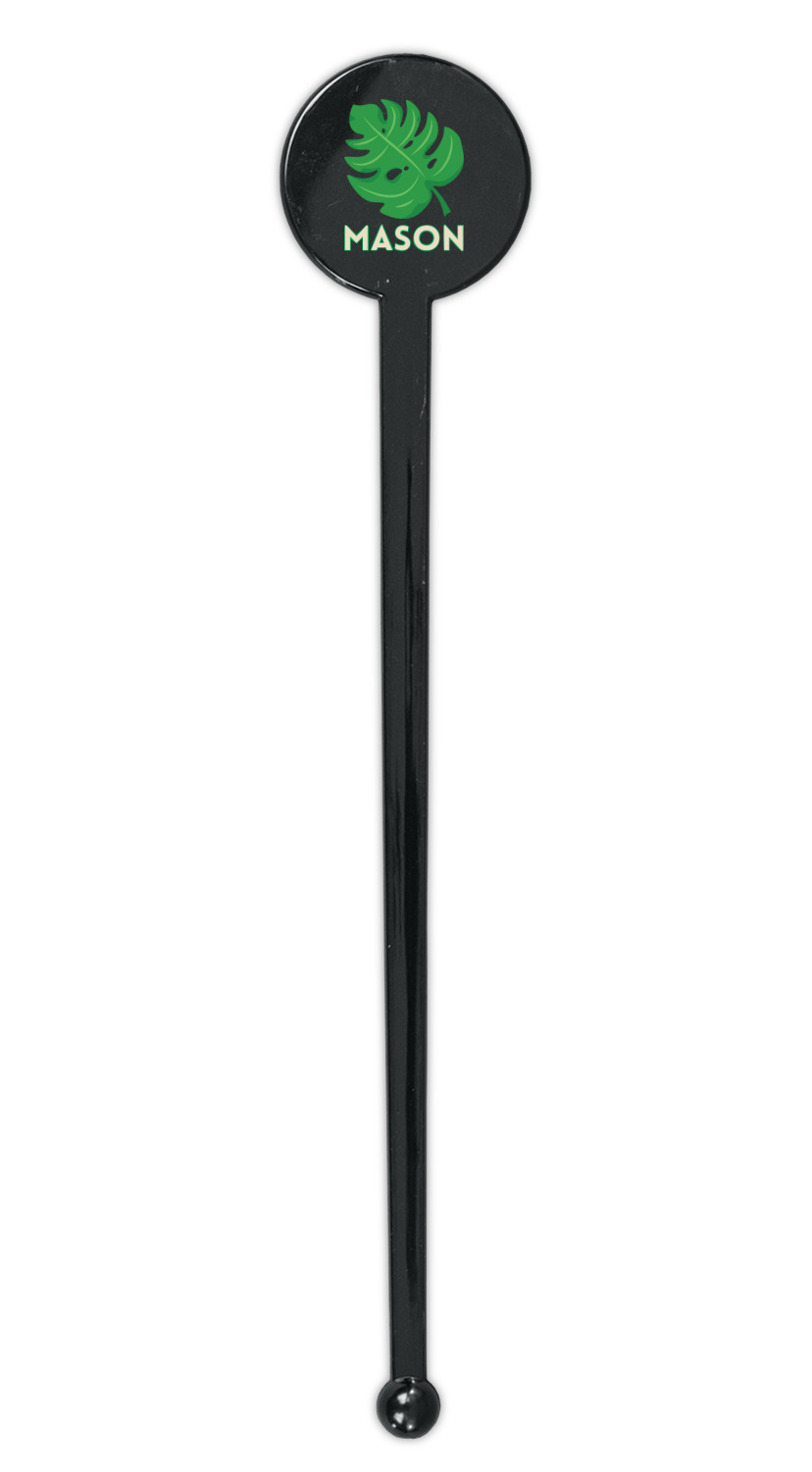 The main design has a cream background with bright green tropical leaves faces every which way. Through the middle of the design sits a cream ribbon, with your personalization on the ribbon itself. Several different kinds of tropical leaves are featured in this fun design.