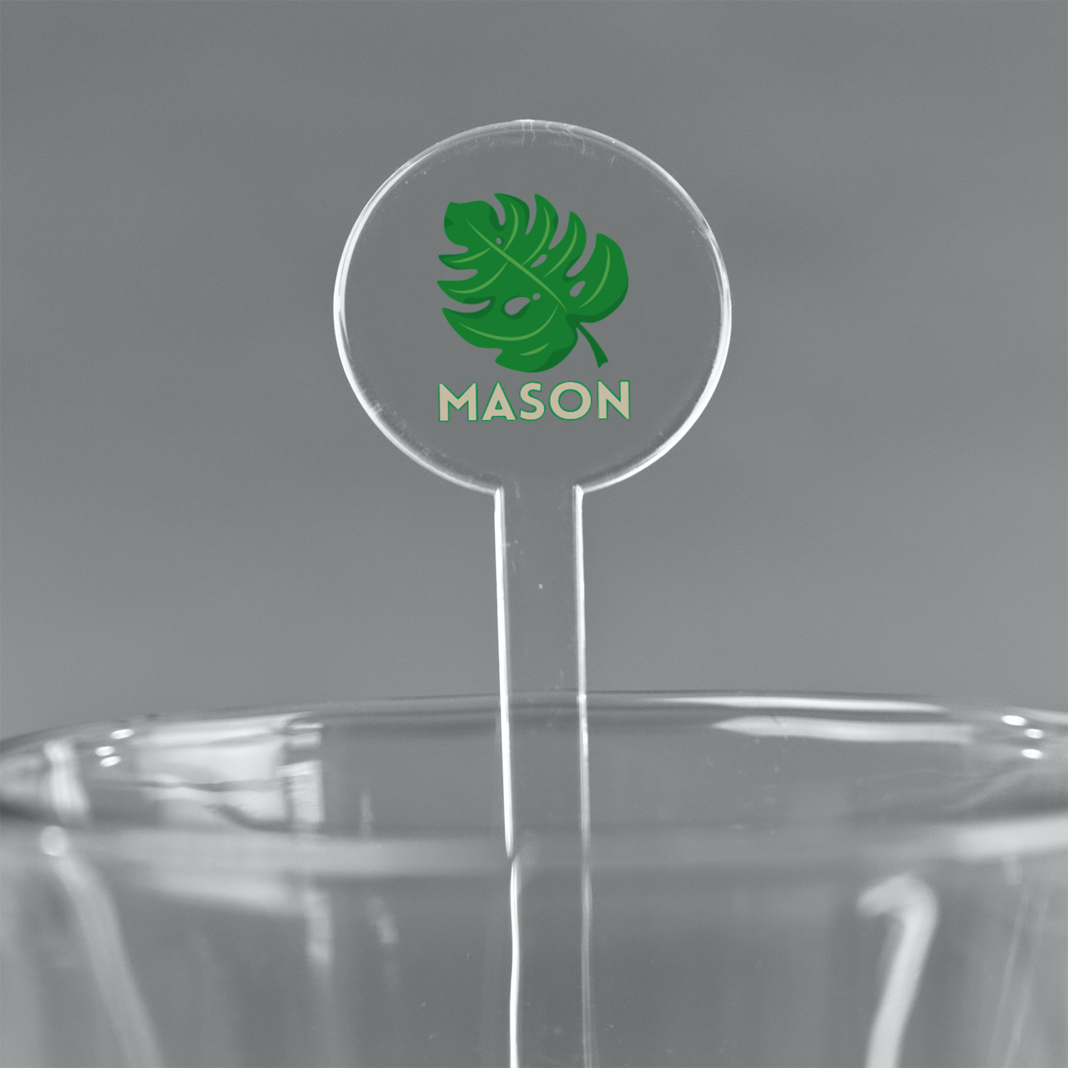 The main design has a cream background with bright green tropical leaves faces every which way. Through the middle of the design sits a cream ribbon, with your personalization on the ribbon itself. Several different kinds of tropical leaves are featured in this fun design.