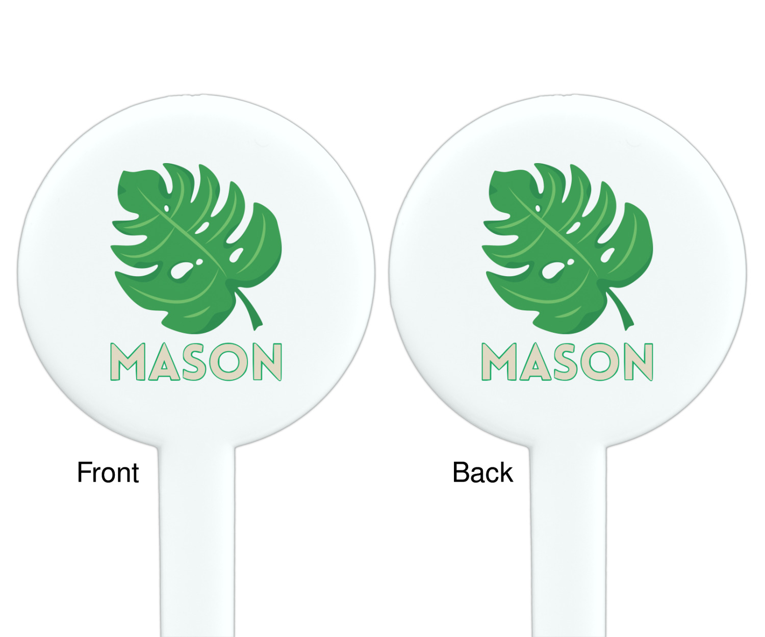 The main design has a cream background with bright green tropical leaves faces every which way. Through the middle of the design sits a cream ribbon, with your personalization on the ribbon itself. Several different kinds of tropical leaves are featured in this fun design.