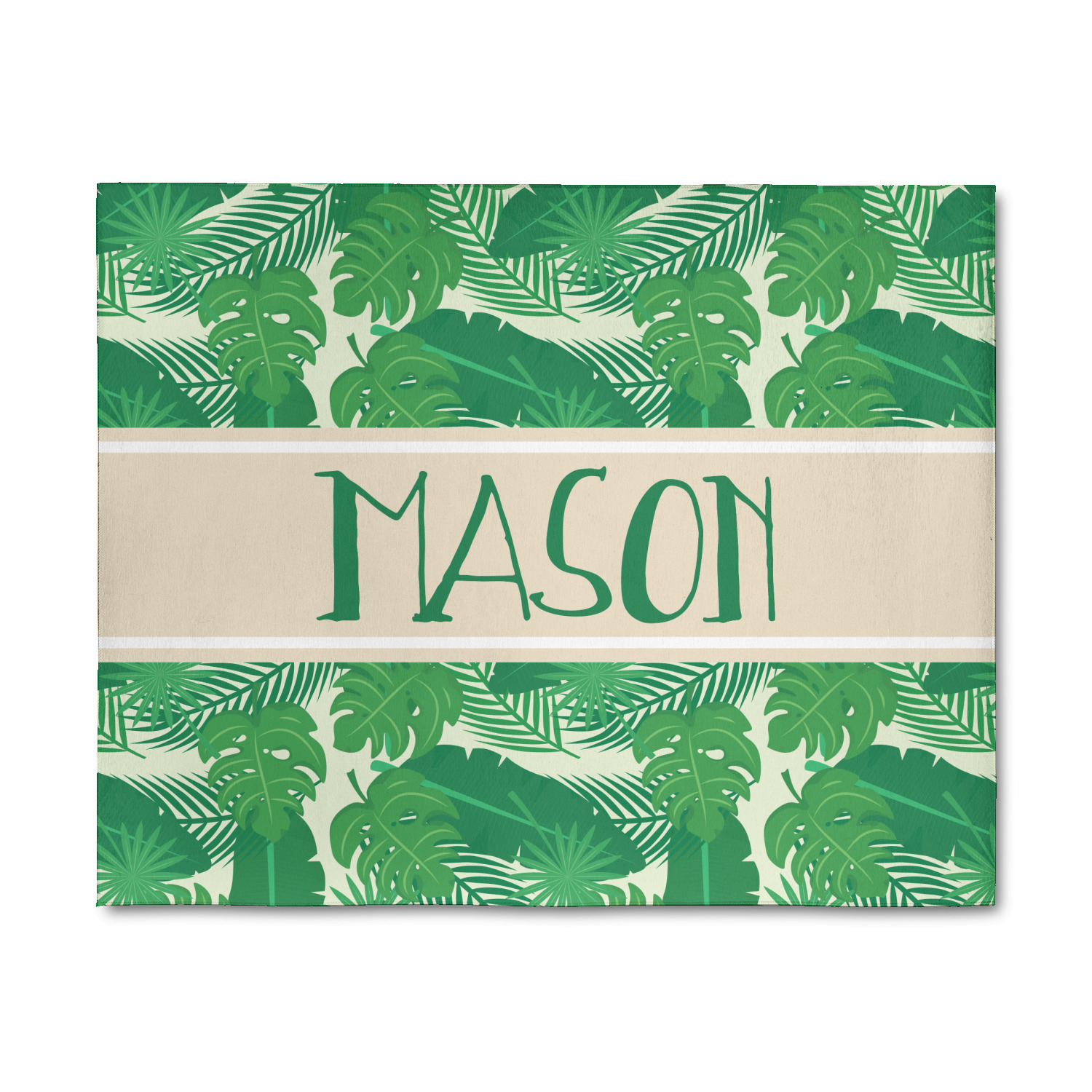 The main design has a cream background with bright green tropical leaves faces every which way. Through the middle of the design sits a cream ribbon, with your personalization on the ribbon itself. Several different kinds of tropical leaves are featured in this fun design.