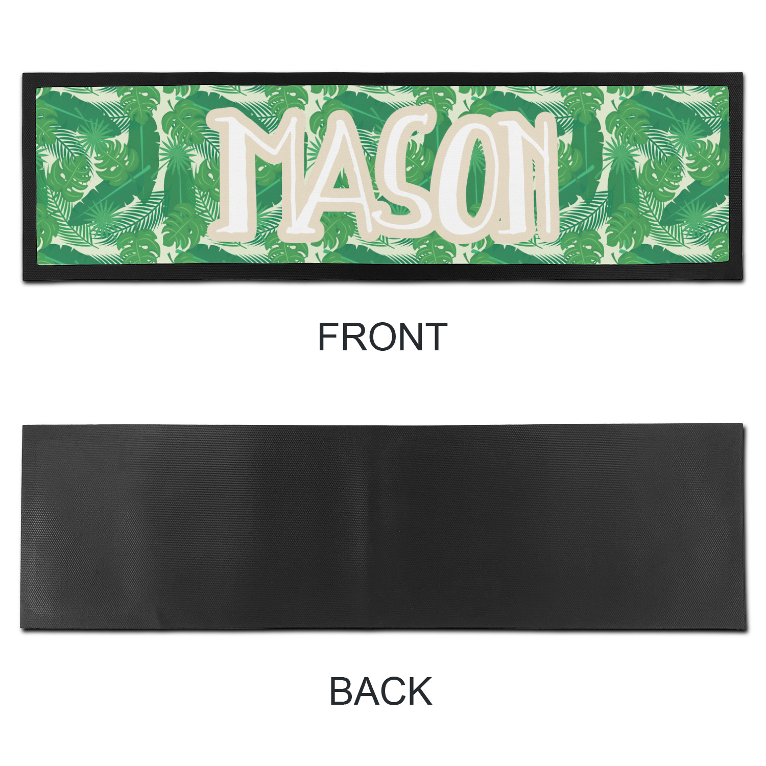 The main design has a cream background with bright green tropical leaves faces every which way. Through the middle of the design sits a cream ribbon, with your personalization on the ribbon itself. Several different kinds of tropical leaves are featured in this fun design.