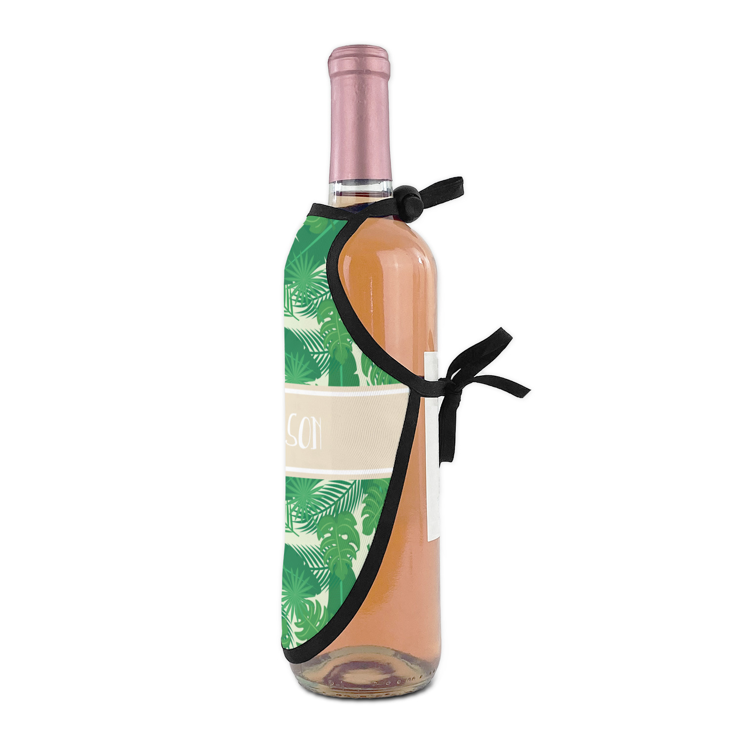 The main design has a cream background with bright green tropical leaves faces every which way. Through the middle of the design sits a cream ribbon, with your personalization on the ribbon itself. Several different kinds of tropical leaves are featured in this fun design.