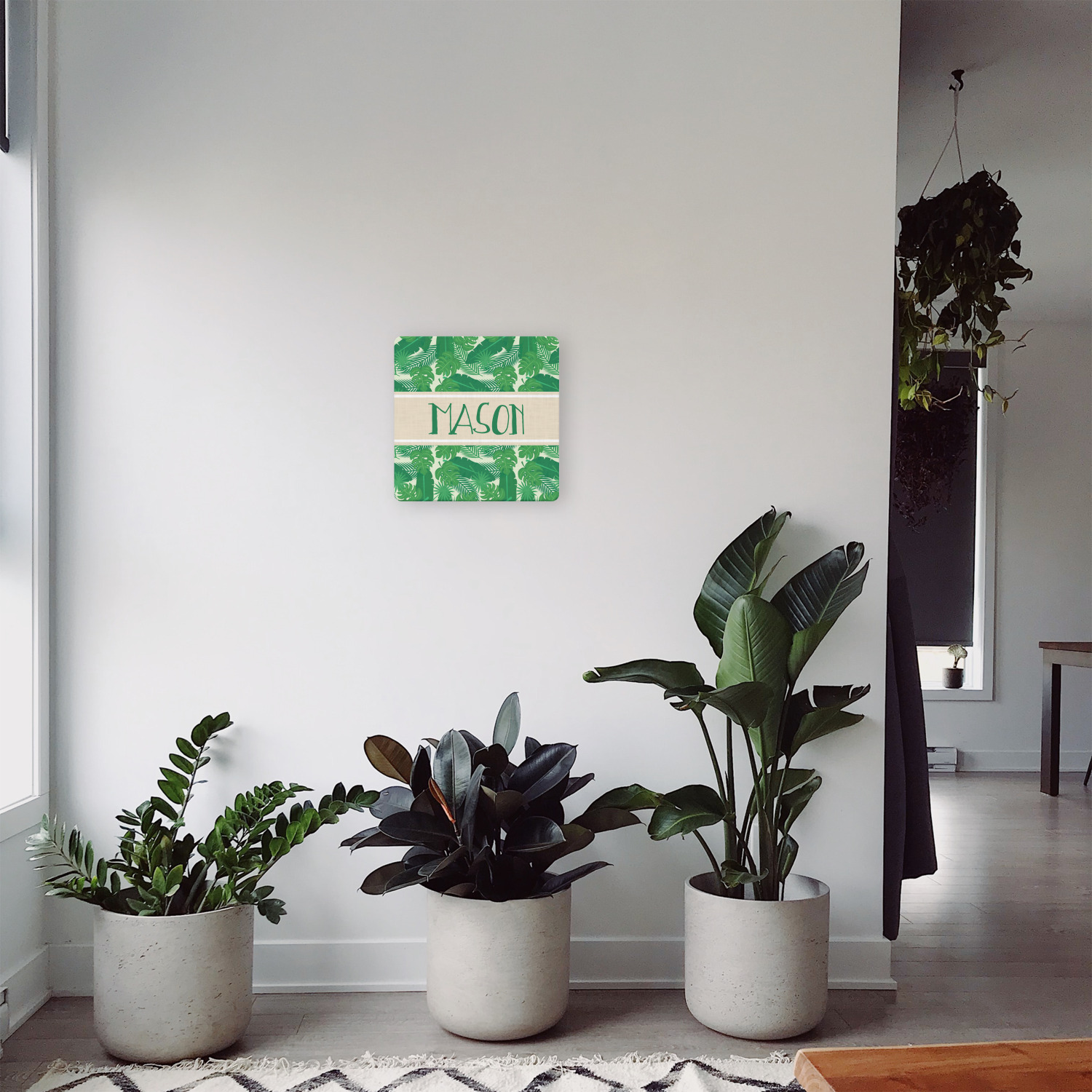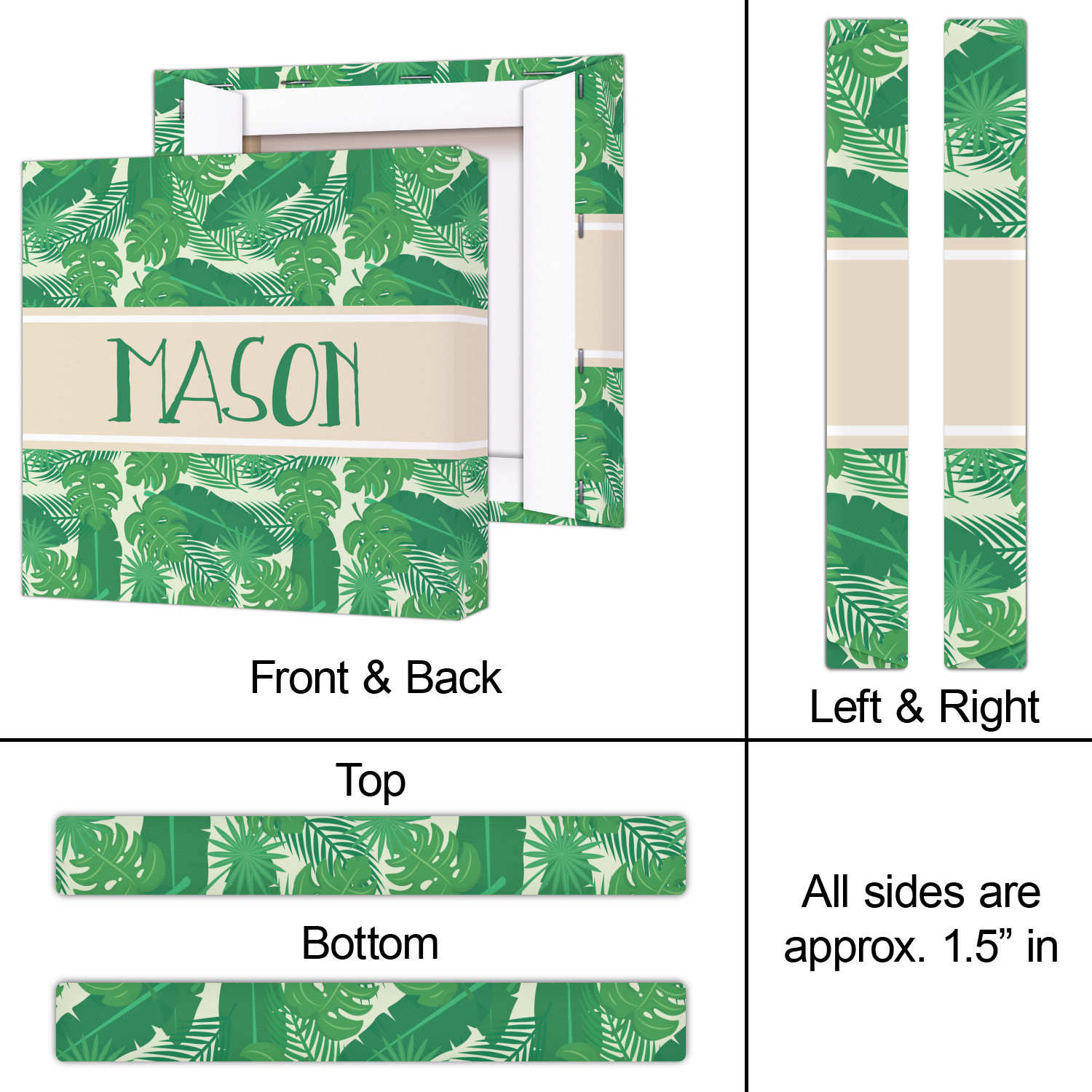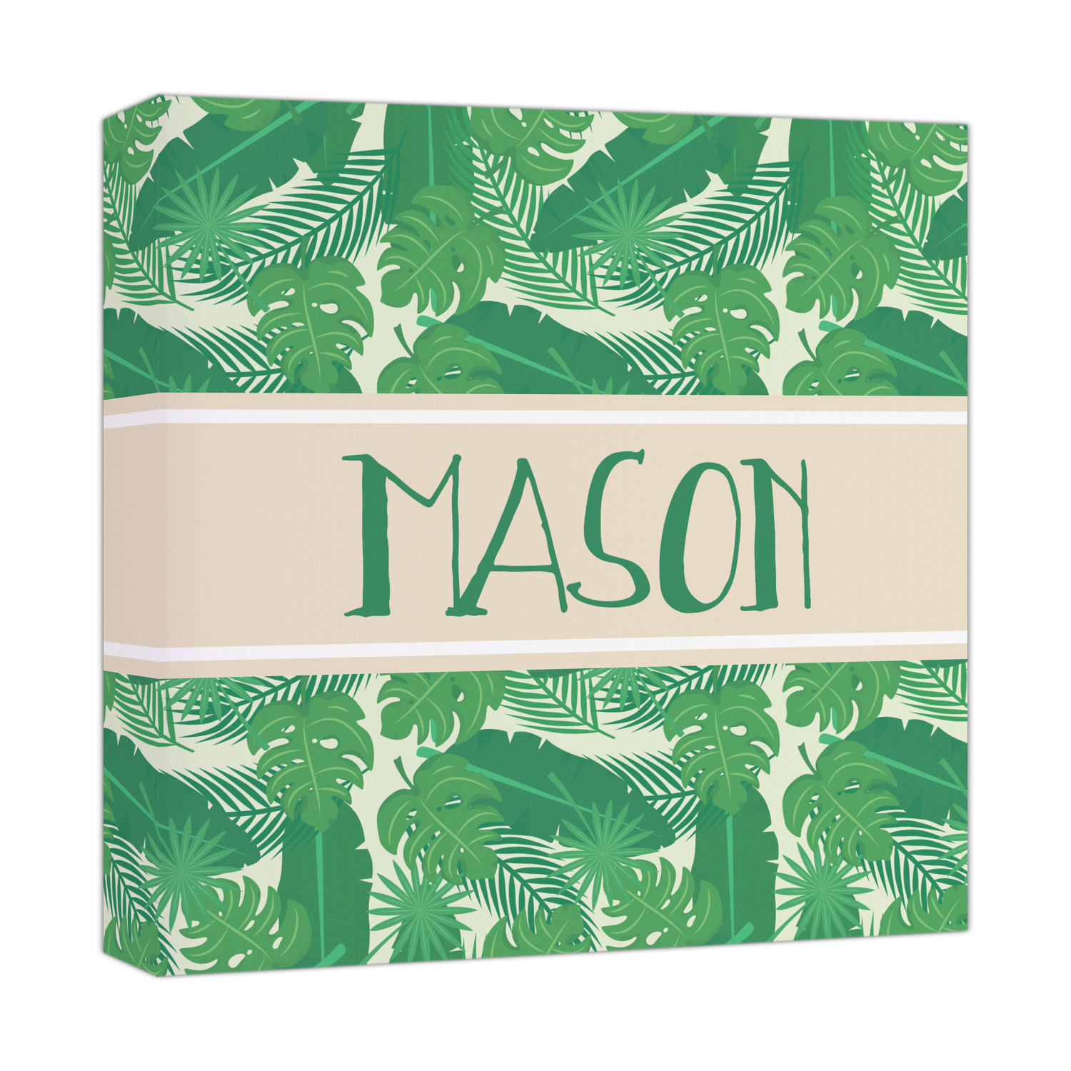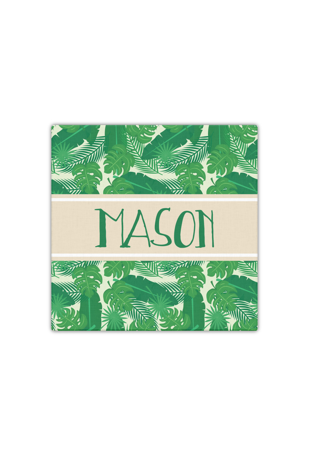 The main design has a cream background with bright green tropical leaves faces every which way. Through the middle of the design sits a cream ribbon, with your personalization on the ribbon itself. Several different kinds of tropical leaves are featured in this fun design.