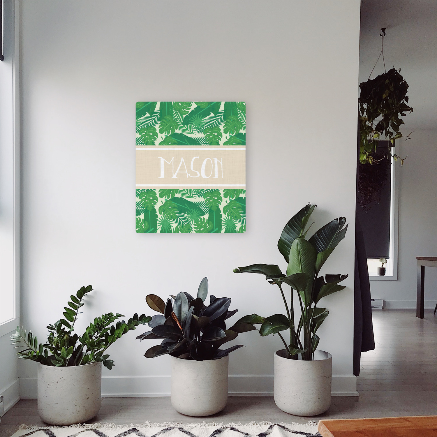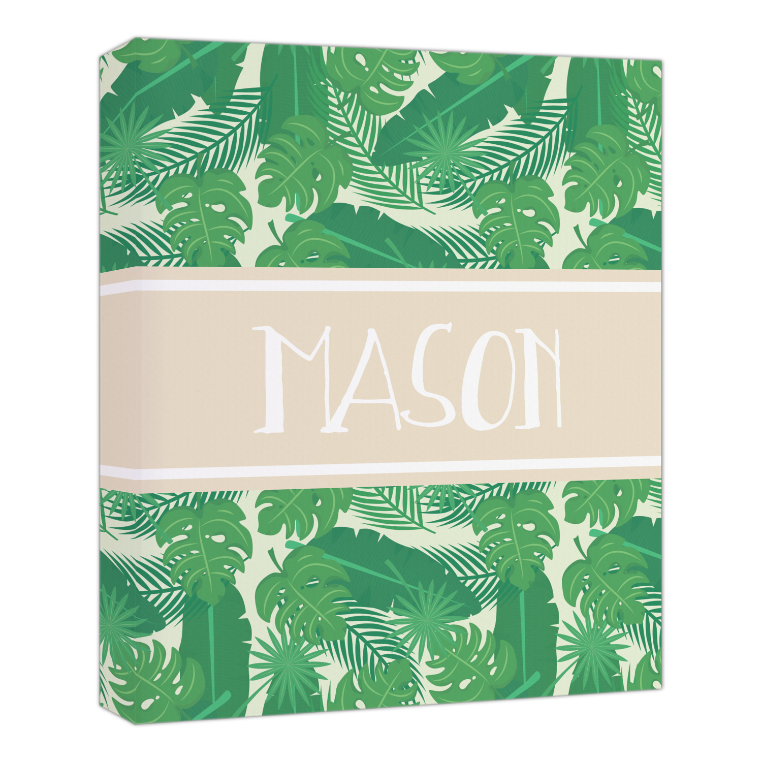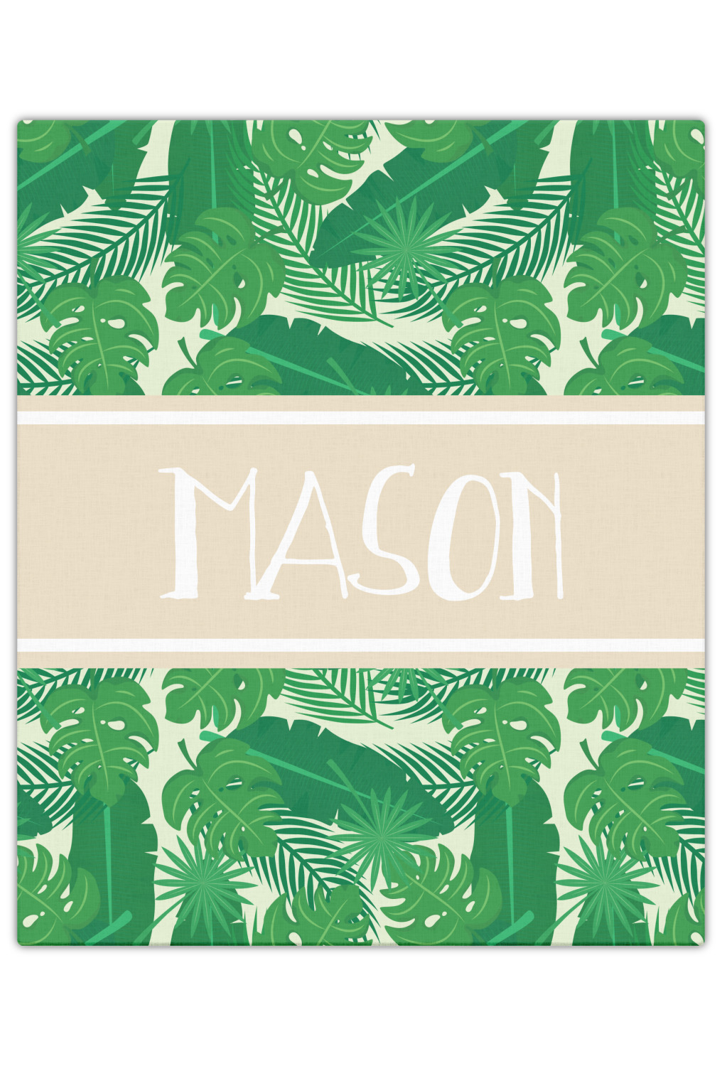 The main design has a cream background with bright green tropical leaves faces every which way. Through the middle of the design sits a cream ribbon, with your personalization on the ribbon itself. Several different kinds of tropical leaves are featured in this fun design.