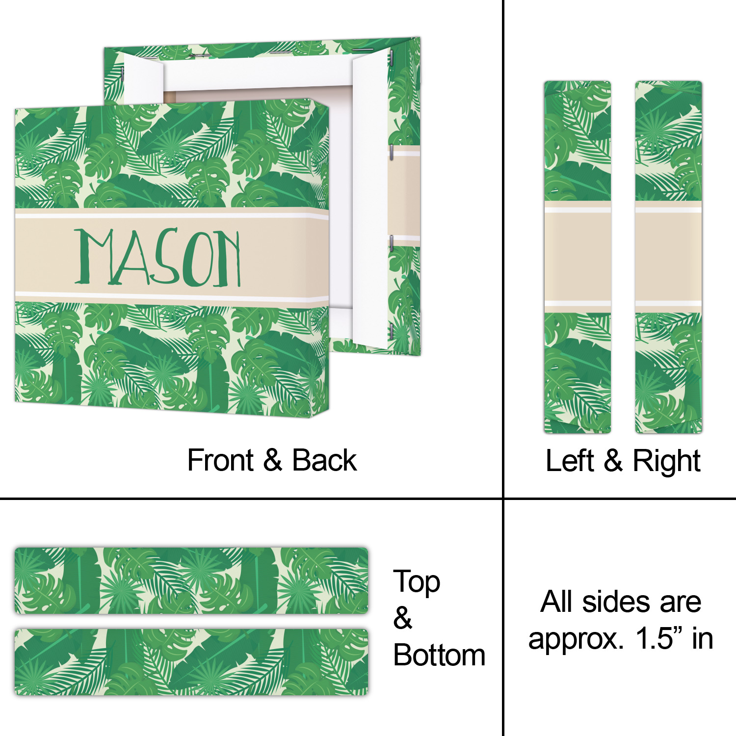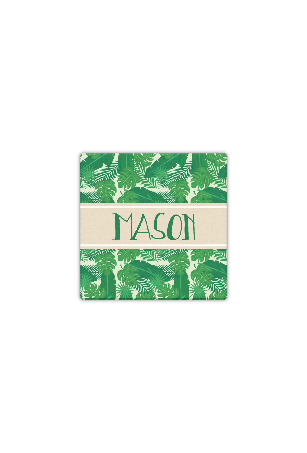 The main design has a cream background with bright green tropical leaves faces every which way. Through the middle of the design sits a cream ribbon, with your personalization on the ribbon itself. Several different kinds of tropical leaves are featured in this fun design.