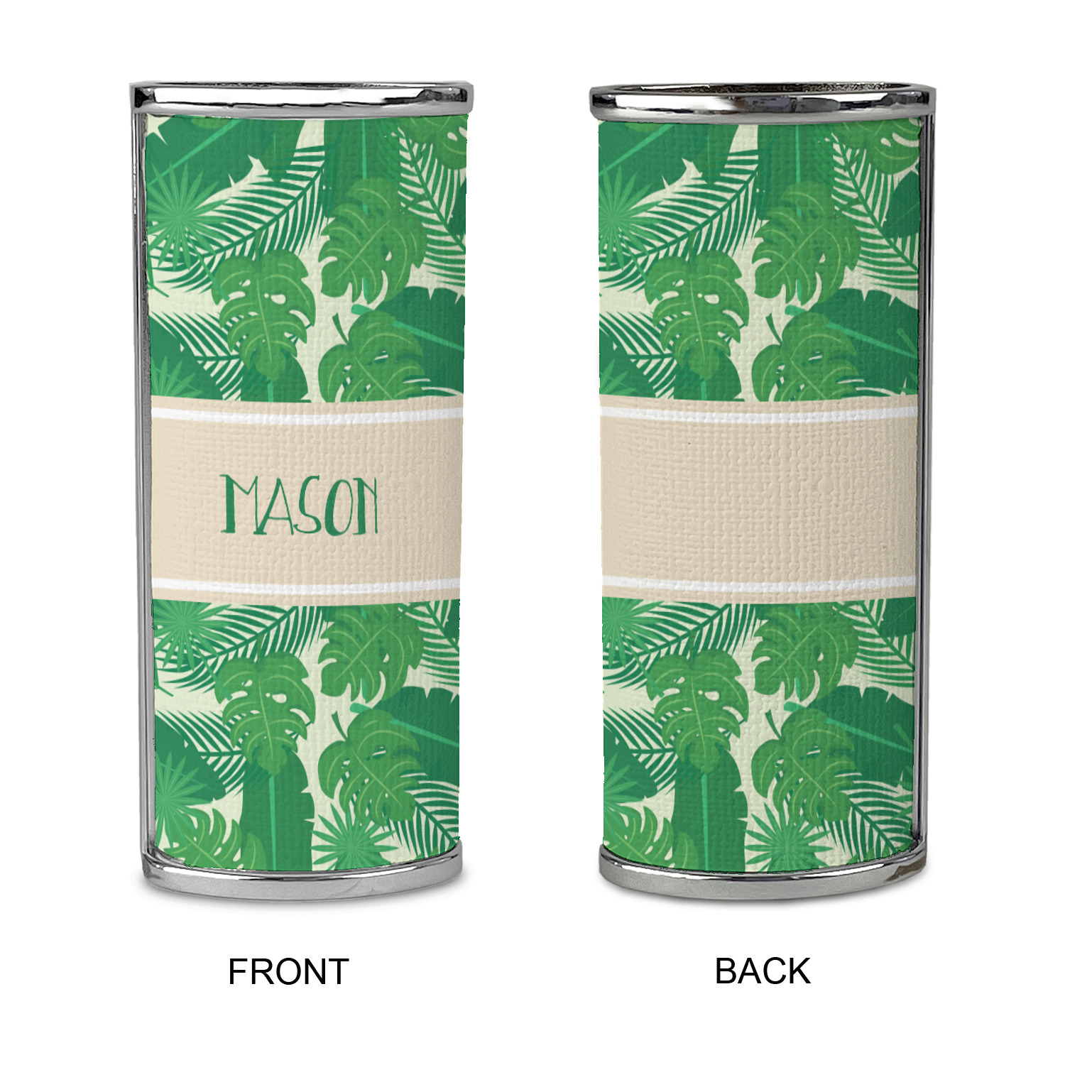 The main design has a cream background with bright green tropical leaves faces every which way. Through the middle of the design sits a cream ribbon, with your personalization on the ribbon itself. Several different kinds of tropical leaves are featured in this fun design.