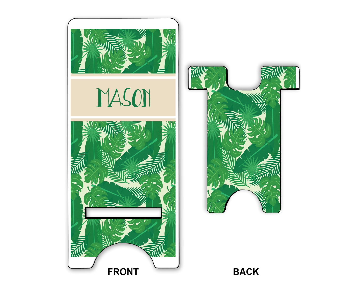 The main design has a cream background with bright green tropical leaves faces every which way. Through the middle of the design sits a cream ribbon, with your personalization on the ribbon itself. Several different kinds of tropical leaves are featured in this fun design.