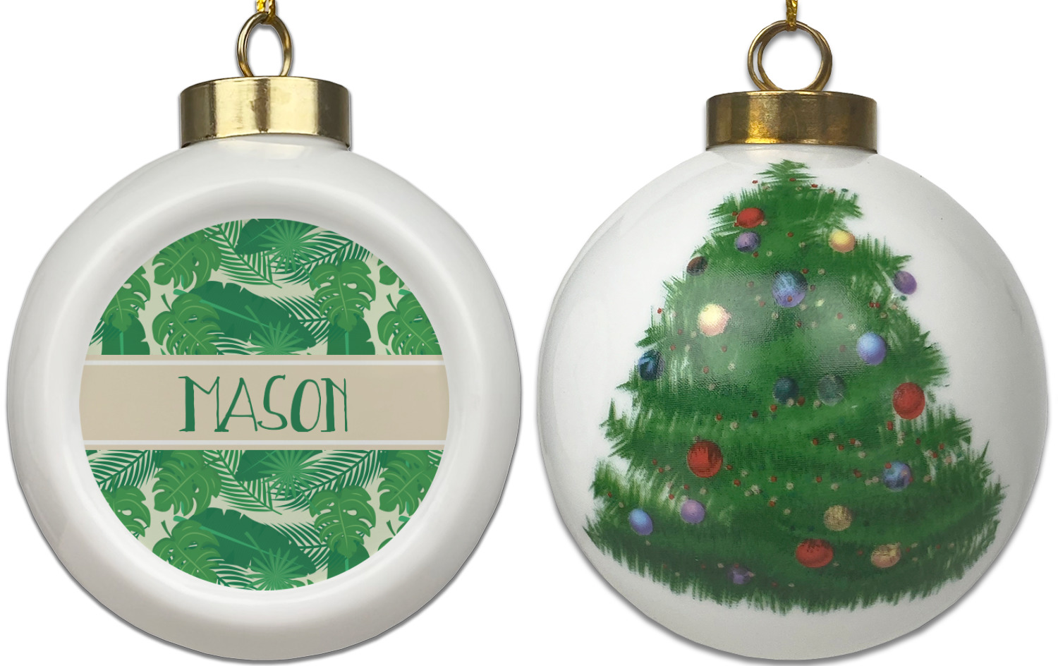 Our Christmas ornaments are a unique ceramic ball shape with a twist as it has a flat face to display your custom design! Select from one of our two design types - Christmas Tree or Poinsettia Garland - to adorn the curved back of your personal design. Each ornament measures 3H x 2.5W x 2D accompanied with a gold string accent for finishing touches to hang on your beautiful Christmas tree!