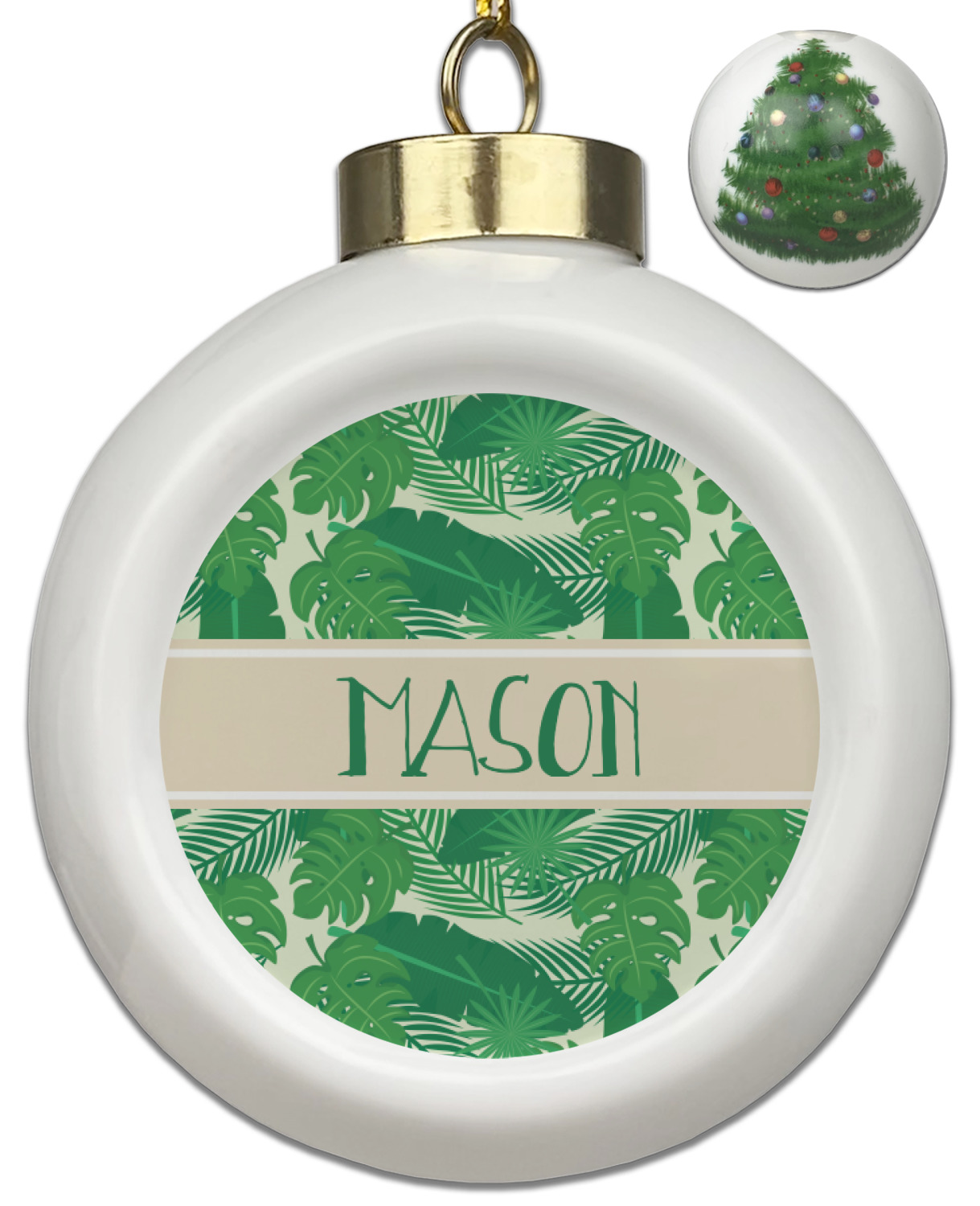 The main design has a cream background with bright green tropical leaves faces every which way. Through the middle of the design sits a cream ribbon, with your personalization on the ribbon itself. Several different kinds of tropical leaves are featured in this fun design.
