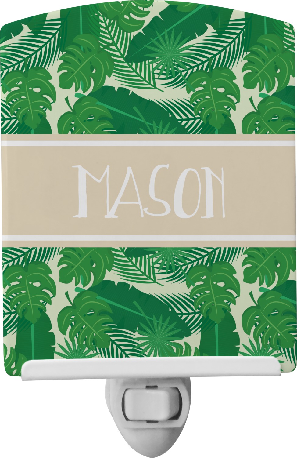 The main design has a cream background with bright green tropical leaves faces every which way. Through the middle of the design sits a cream ribbon, with your personalization on the ribbon itself. Several different kinds of tropical leaves are featured in this fun design.