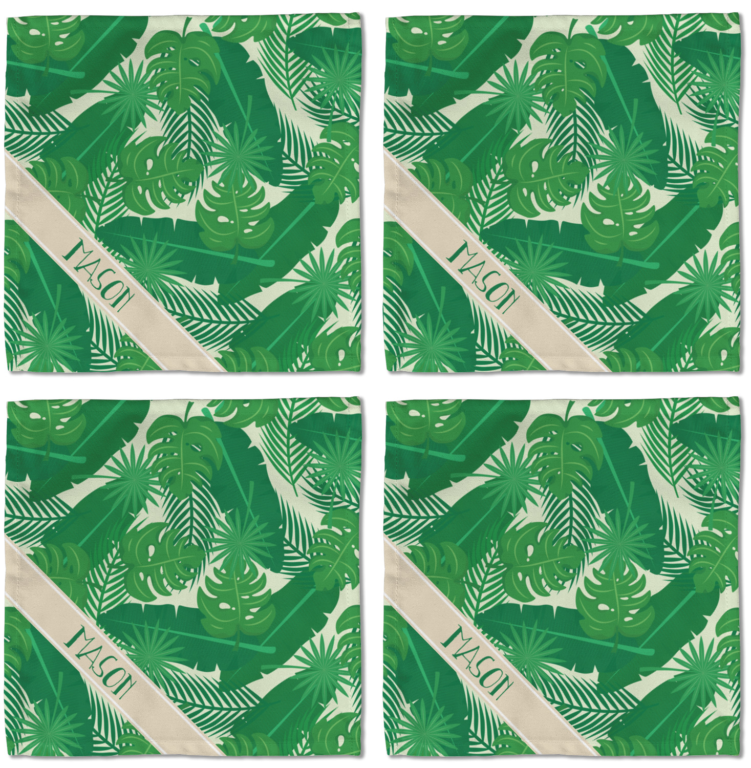 The main design has a cream background with bright green tropical leaves faces every which way. Through the middle of the design sits a cream ribbon, with your personalization on the ribbon itself. Several different kinds of tropical leaves are featured in this fun design.