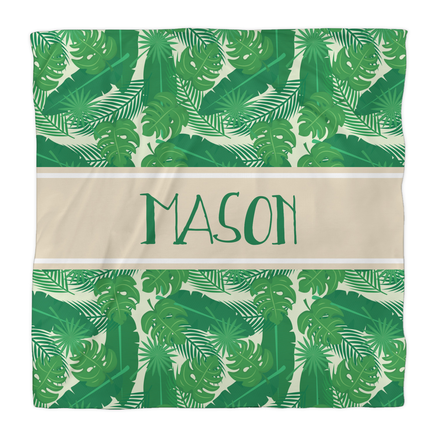 The main design has a cream background with bright green tropical leaves faces every which way. Through the middle of the design sits a cream ribbon, with your personalization on the ribbon itself. Several different kinds of tropical leaves are featured in this fun design.