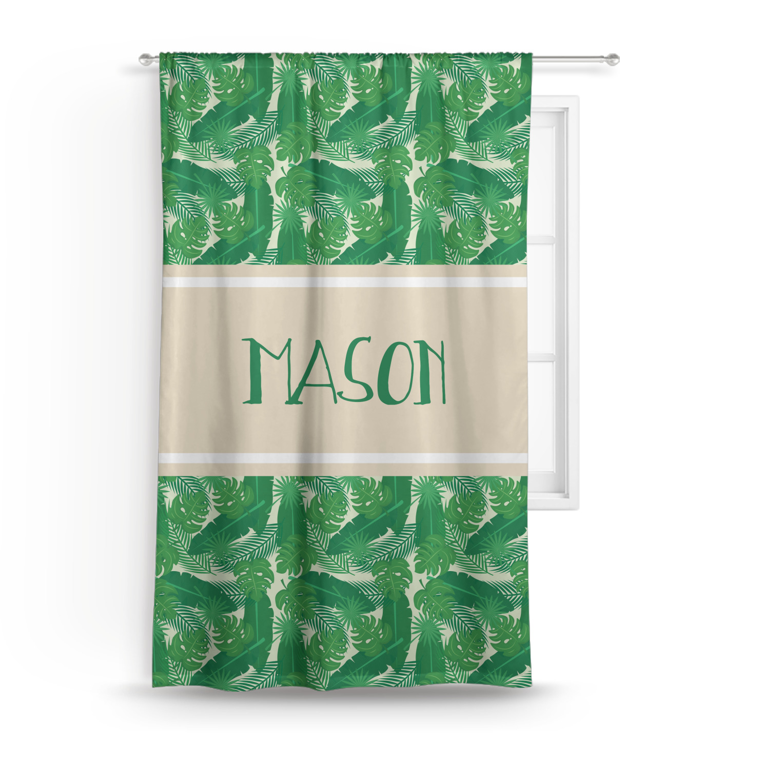 The main design has a cream background with bright green tropical leaves faces every which way. Through the middle of the design sits a cream ribbon, with your personalization on the ribbon itself. Several different kinds of tropical leaves are featured in this fun design.