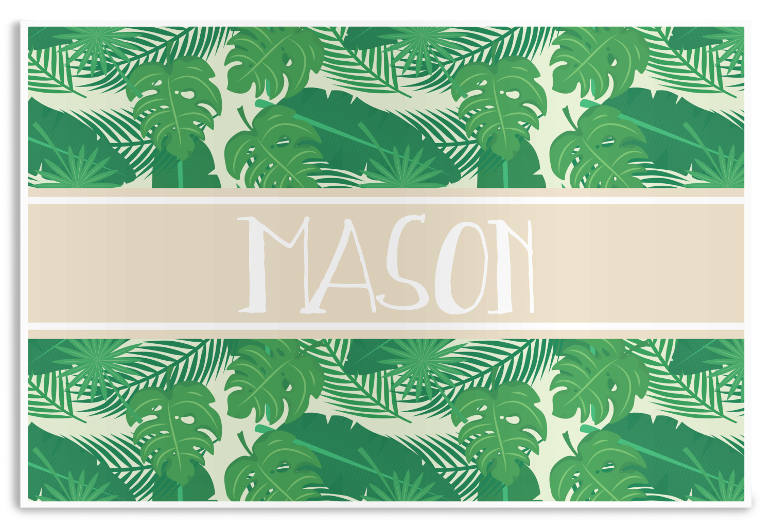 The main design has a cream background with bright green tropical leaves faces every which way. Through the middle of the design sits a cream ribbon, with your personalization on the ribbon itself. Several different kinds of tropical leaves are featured in this fun design.