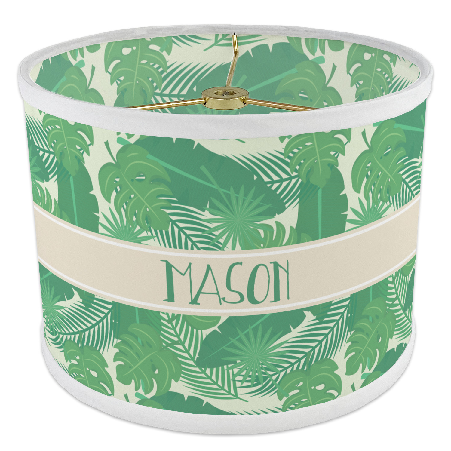The main design has a cream background with bright green tropical leaves faces every which way. Through the middle of the design sits a cream ribbon, with your personalization on the ribbon itself. Several different kinds of tropical leaves are featured in this fun design.
