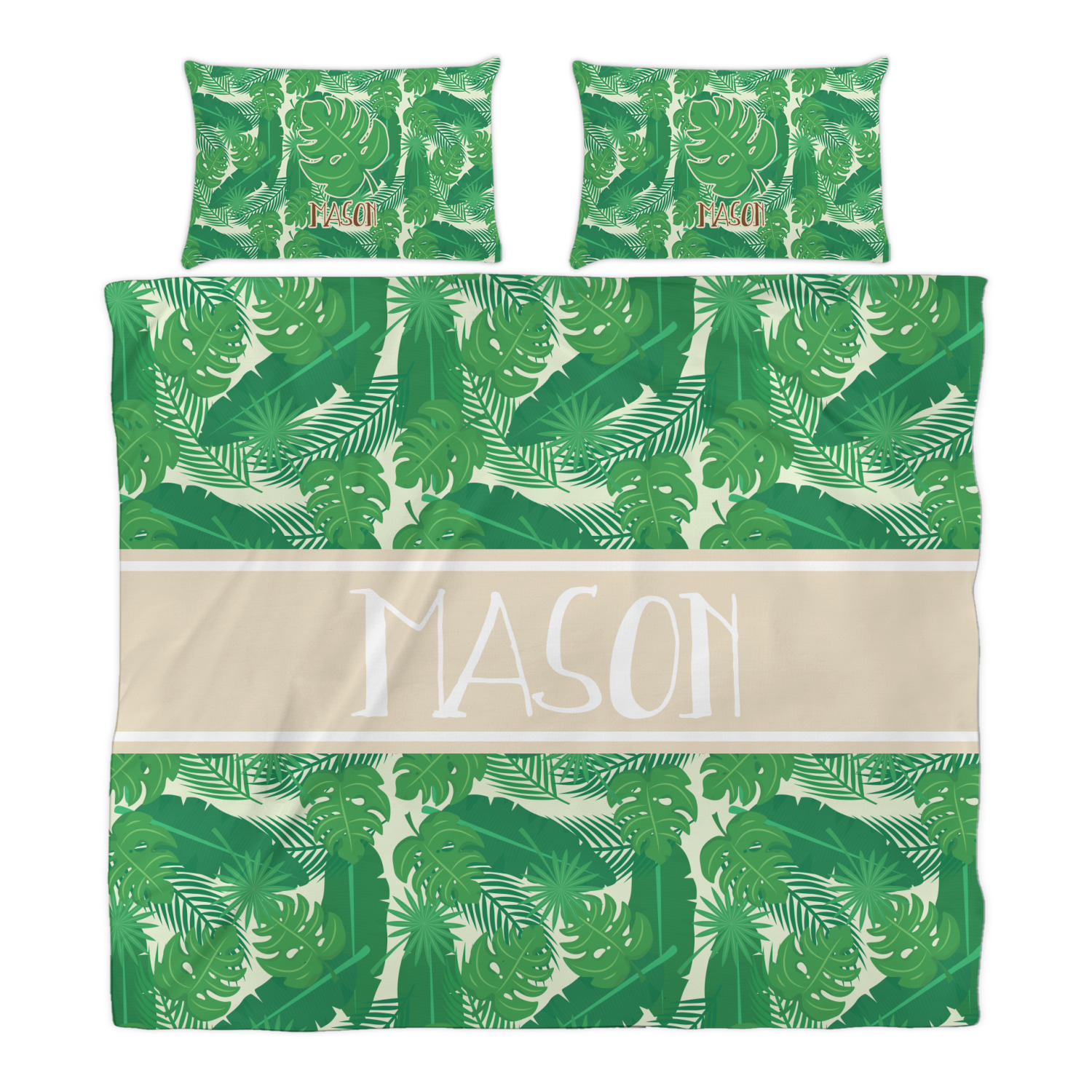 The main design has a cream background with bright green tropical leaves faces every which way. Through the middle of the design sits a cream ribbon, with your personalization on the ribbon itself. Several different kinds of tropical leaves are featured in this fun design.