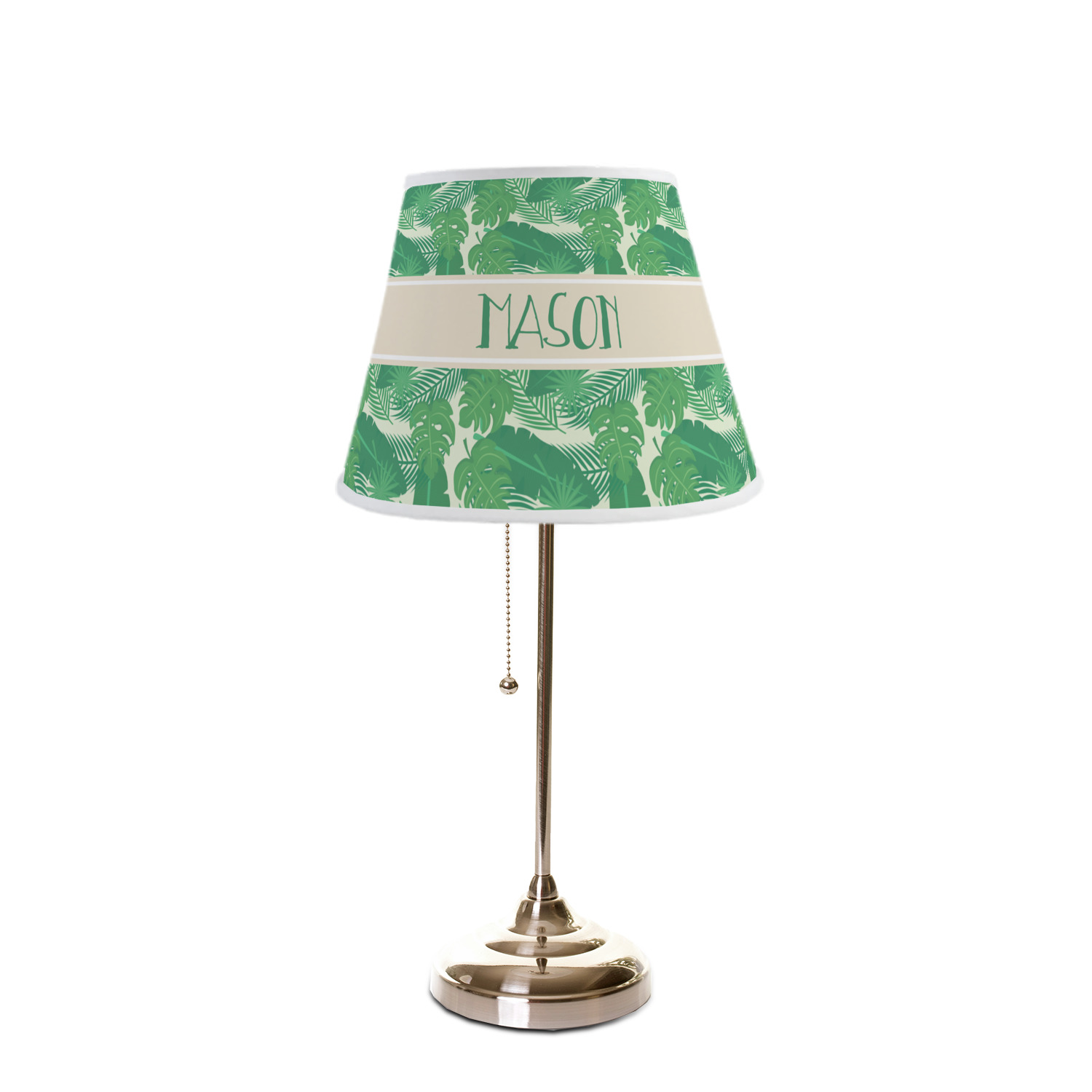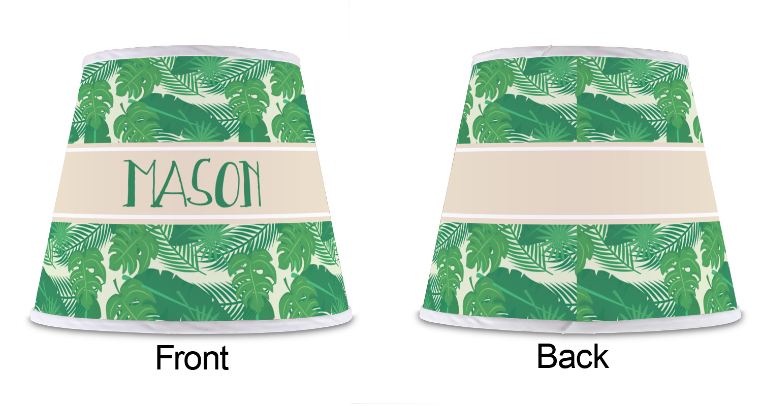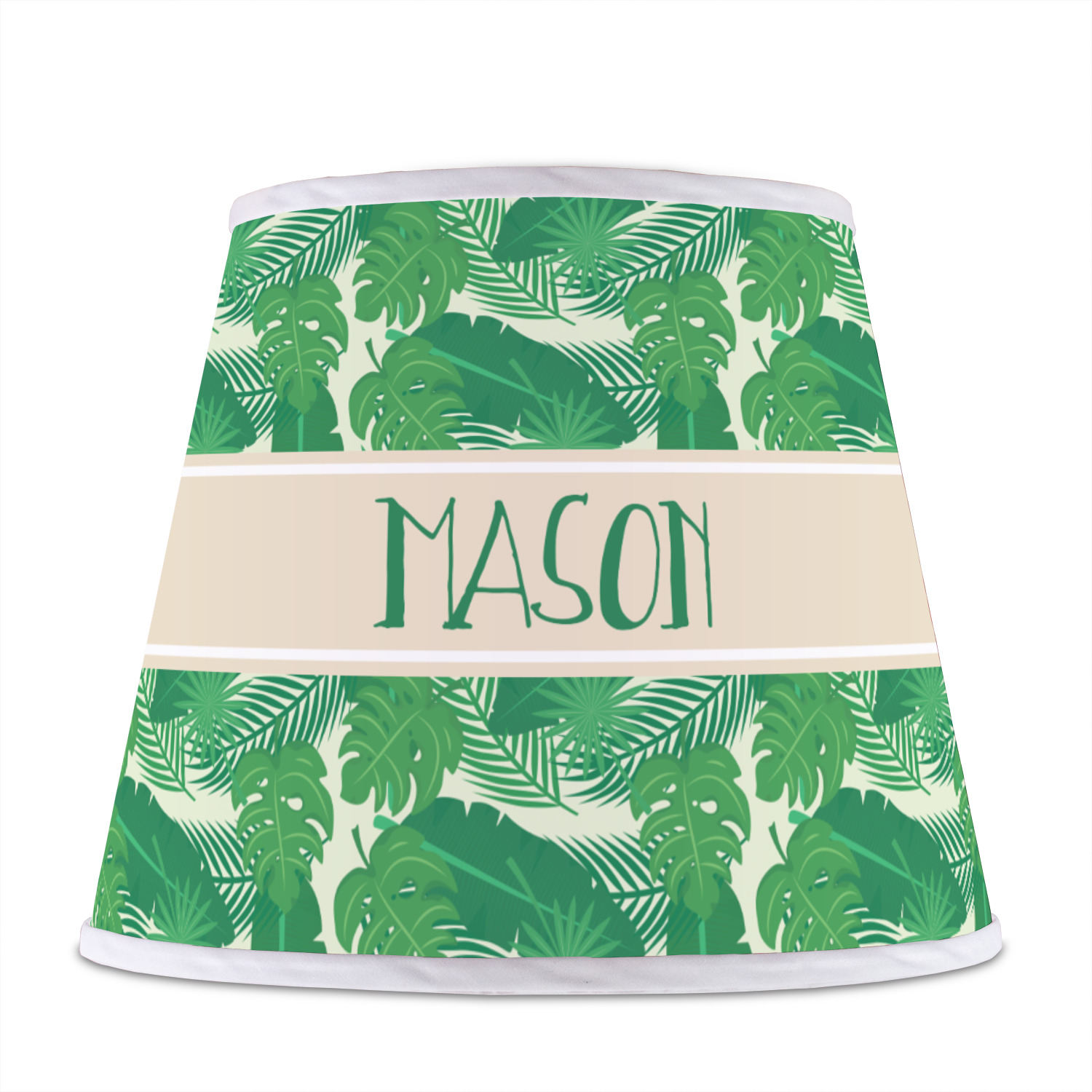 The main design has a cream background with bright green tropical leaves faces every which way. Through the middle of the design sits a cream ribbon, with your personalization on the ribbon itself. Several different kinds of tropical leaves are featured in this fun design.
