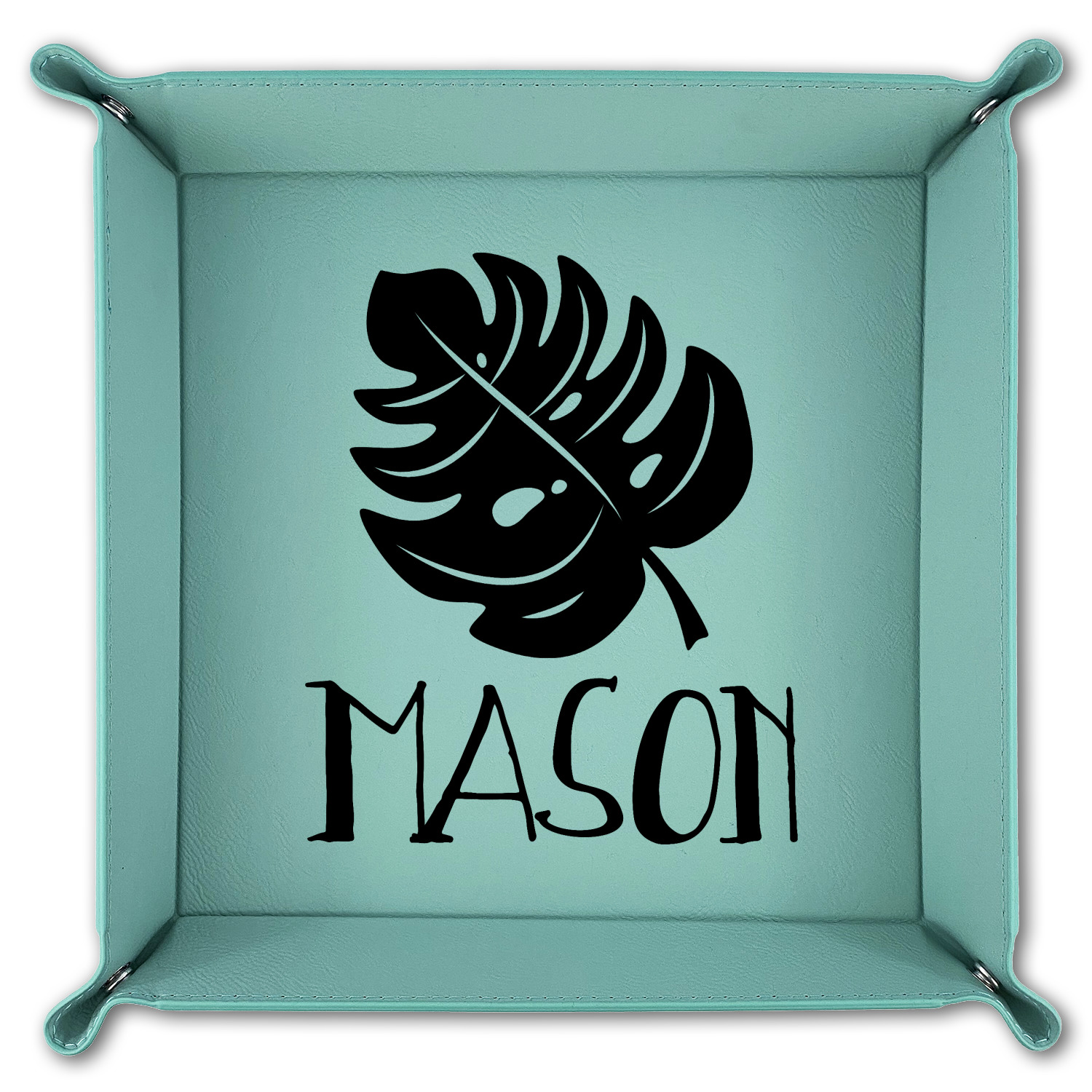 The main design has a cream background with bright green tropical leaves faces every which way. Through the middle of the design sits a cream ribbon, with your personalization on the ribbon itself. Several different kinds of tropical leaves are featured in this fun design.