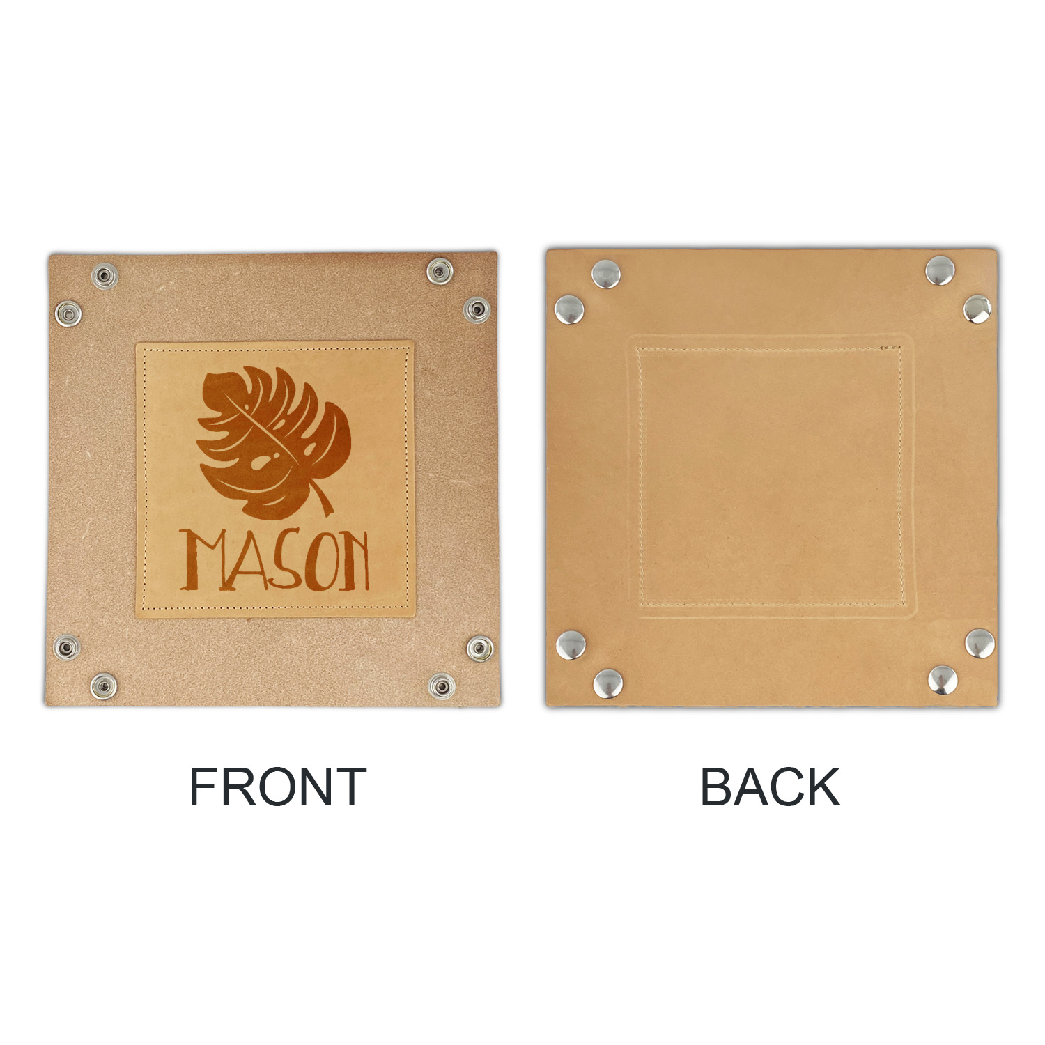 The main design has a cream background with bright green tropical leaves faces every which way. Through the middle of the design sits a cream ribbon, with your personalization on the ribbon itself. Several different kinds of tropical leaves are featured in this fun design.