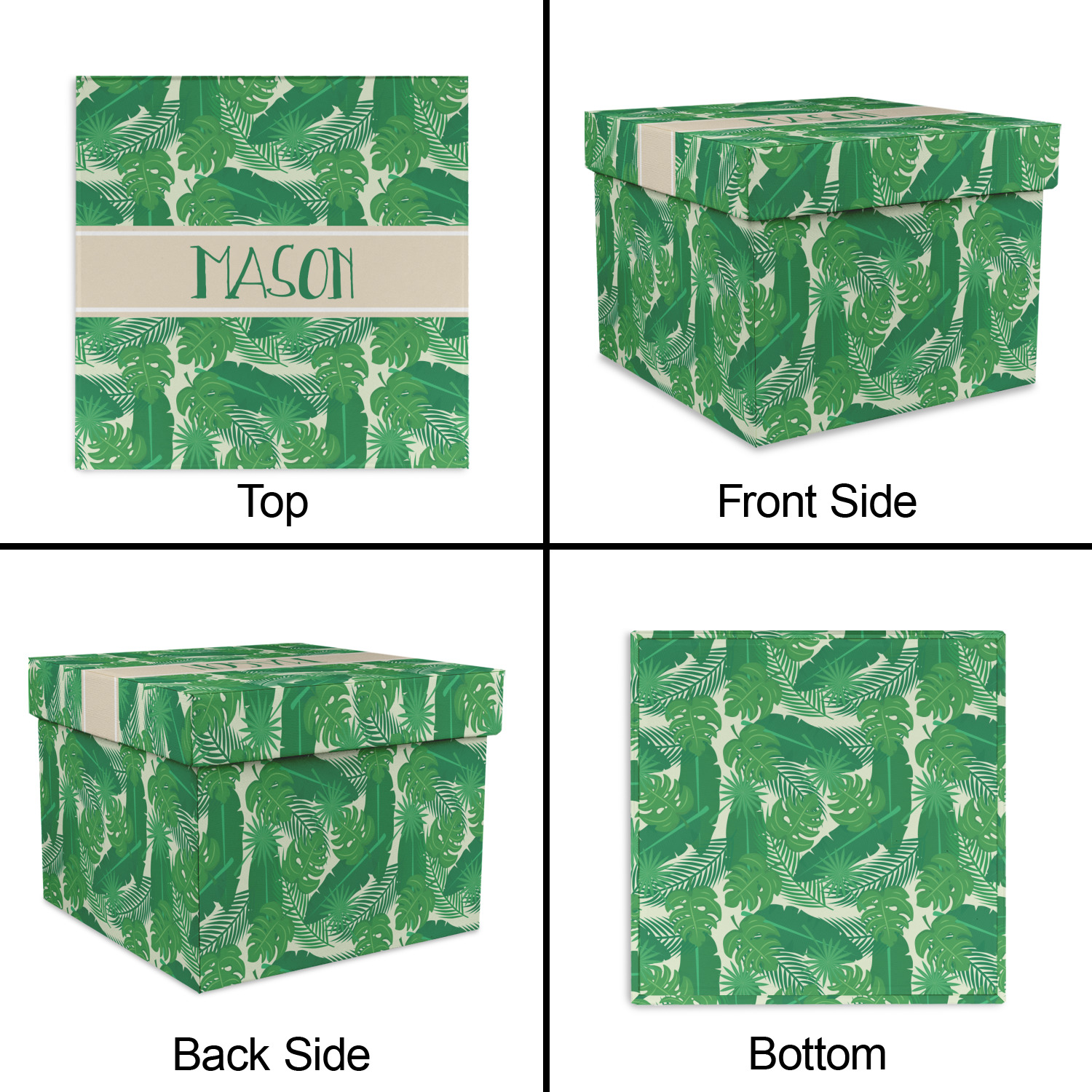 The main design has a cream background with bright green tropical leaves faces every which way. Through the middle of the design sits a cream ribbon, with your personalization on the ribbon itself. Several different kinds of tropical leaves are featured in this fun design.