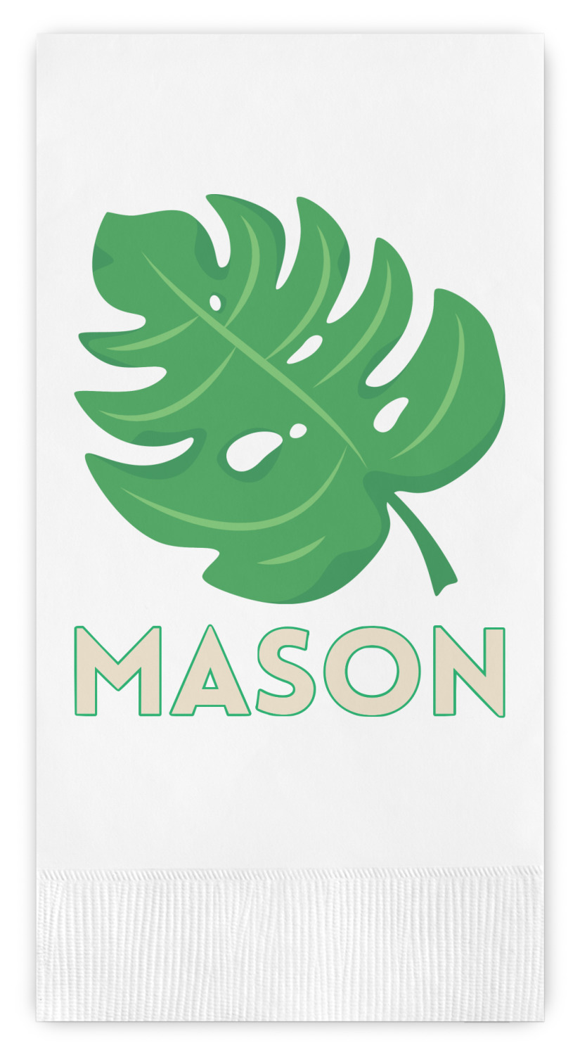 The main design has a cream background with bright green tropical leaves faces every which way. Through the middle of the design sits a cream ribbon, with your personalization on the ribbon itself. Several different kinds of tropical leaves are featured in this fun design.