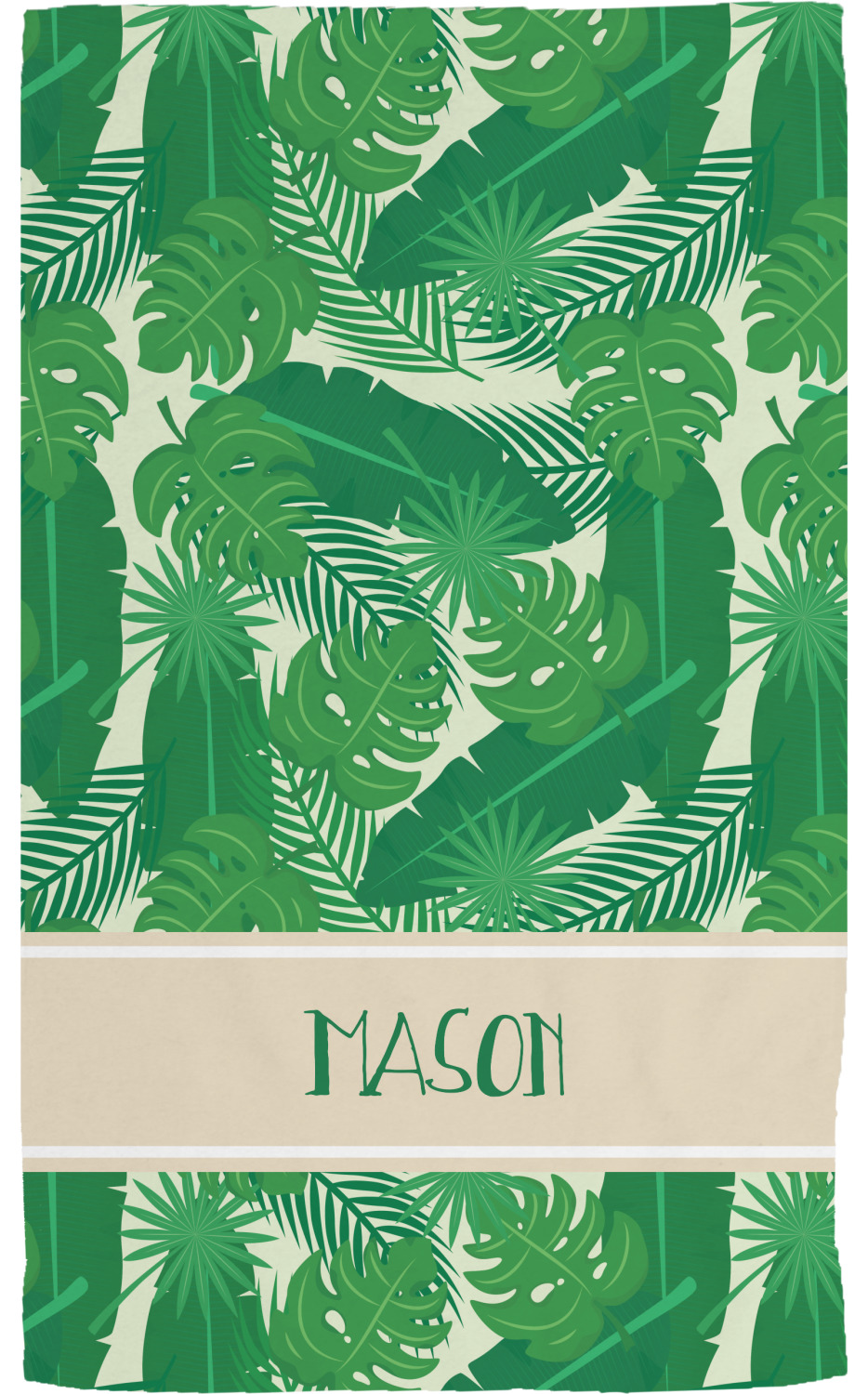 The main design has a cream background with bright green tropical leaves faces every which way. Through the middle of the design sits a cream ribbon, with your personalization on the ribbon itself. Several different kinds of tropical leaves are featured in this fun design.