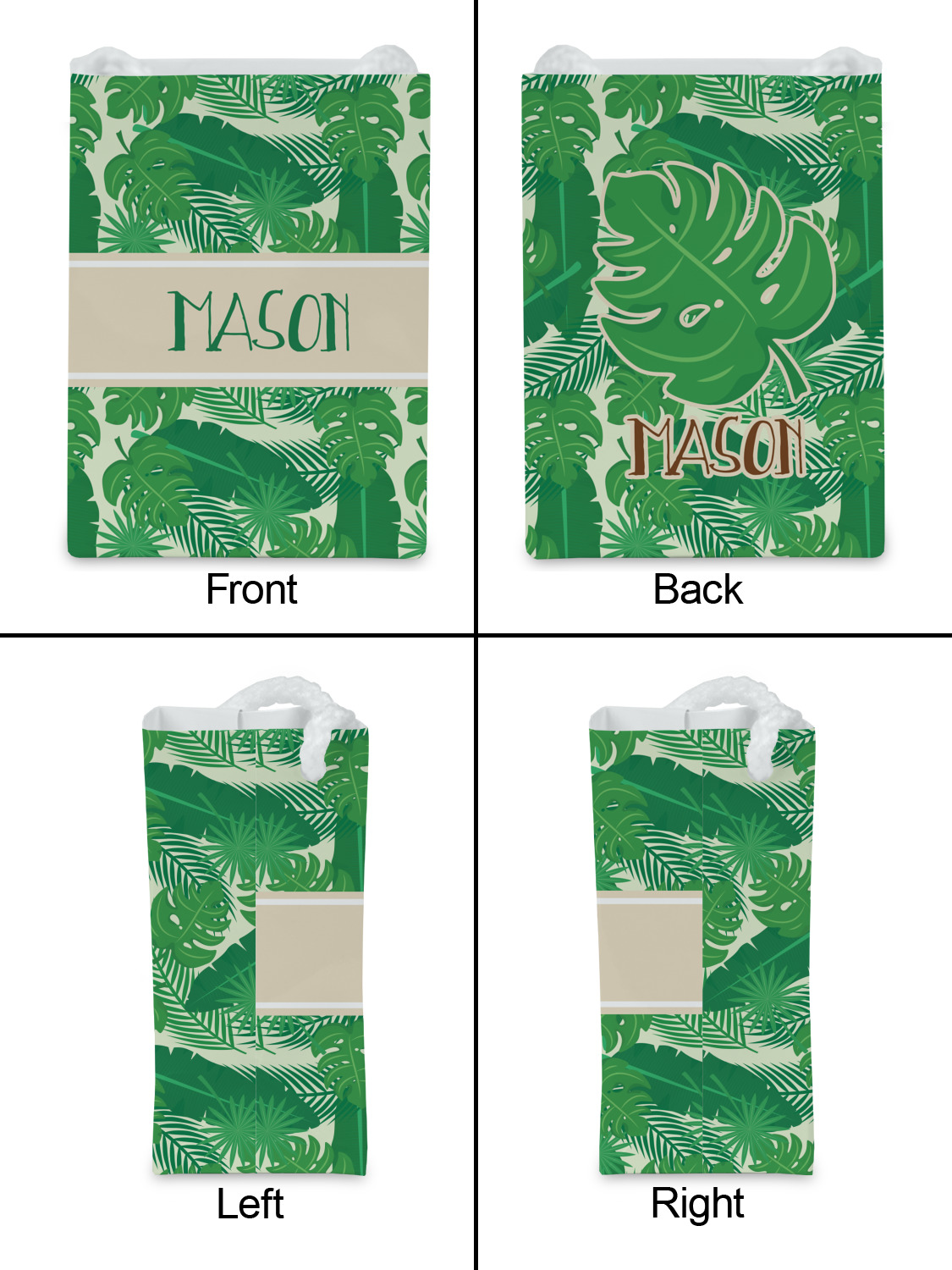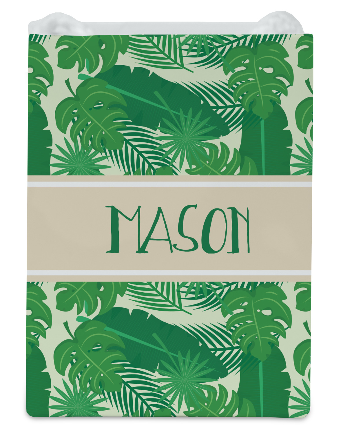 The main design has a cream background with bright green tropical leaves faces every which way. Through the middle of the design sits a cream ribbon, with your personalization on the ribbon itself. Several different kinds of tropical leaves are featured in this fun design.
