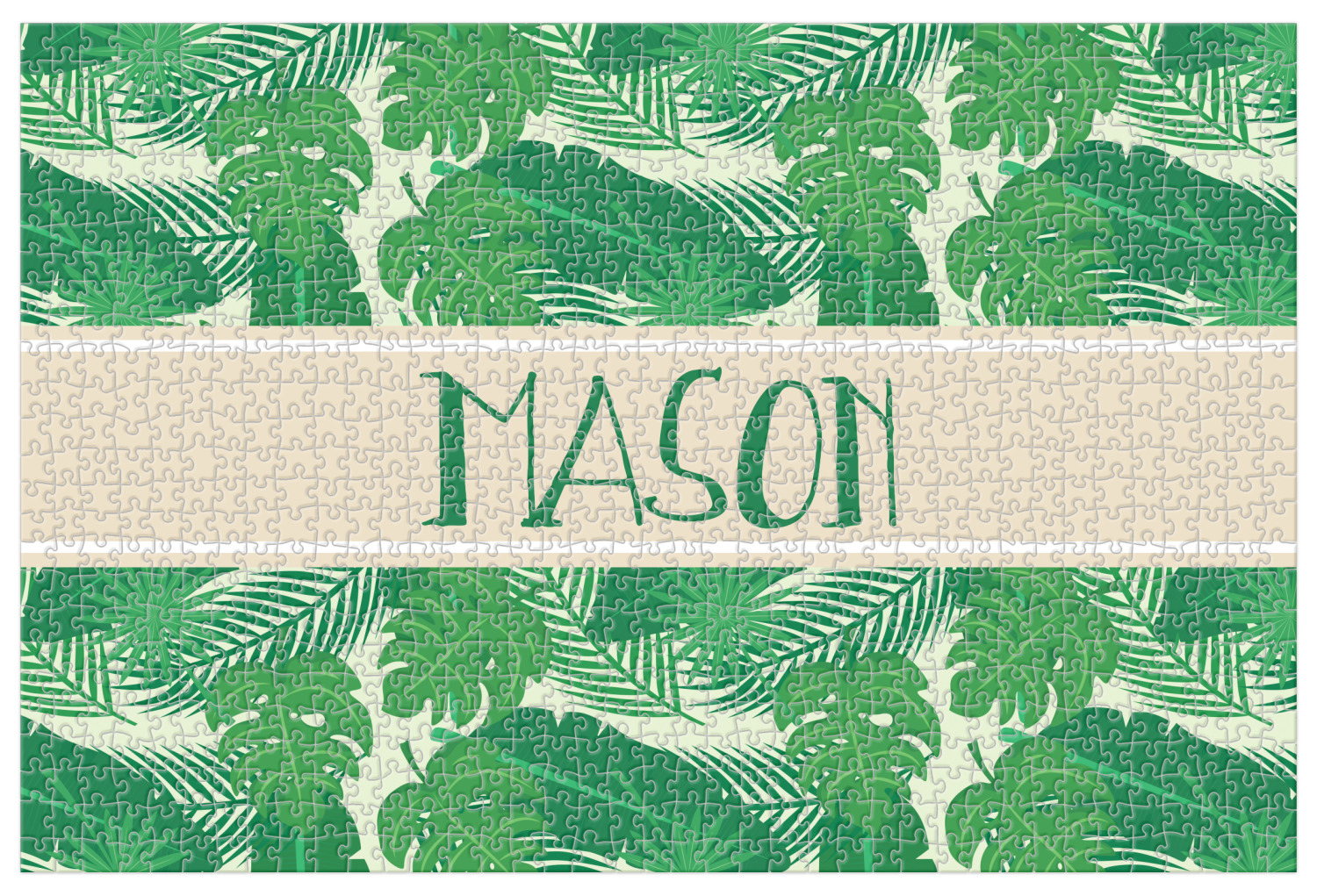The main design has a cream background with bright green tropical leaves faces every which way. Through the middle of the design sits a cream ribbon, with your personalization on the ribbon itself. Several different kinds of tropical leaves are featured in this fun design.