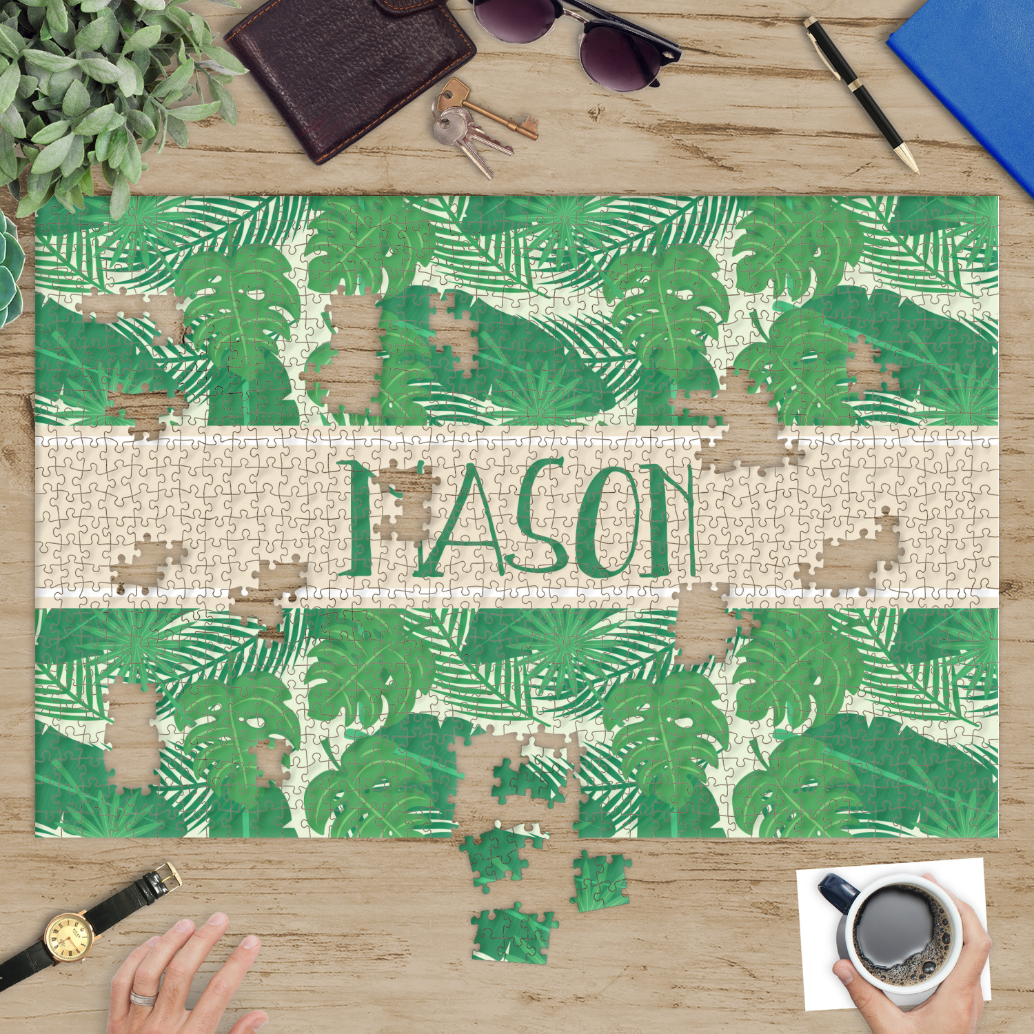 Depending on the look you are trying to achieve, you can add; a thematic pattern or background, with a photo in a frame and text or personalization to your puzzle. Basically if you can imagine it, you can design it!