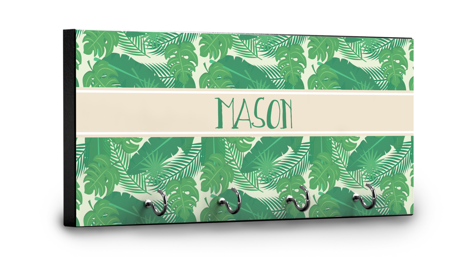 The main design has a cream background with bright green tropical leaves faces every which way. Through the middle of the design sits a cream ribbon, with your personalization on the ribbon itself. Several different kinds of tropical leaves are featured in this fun design.