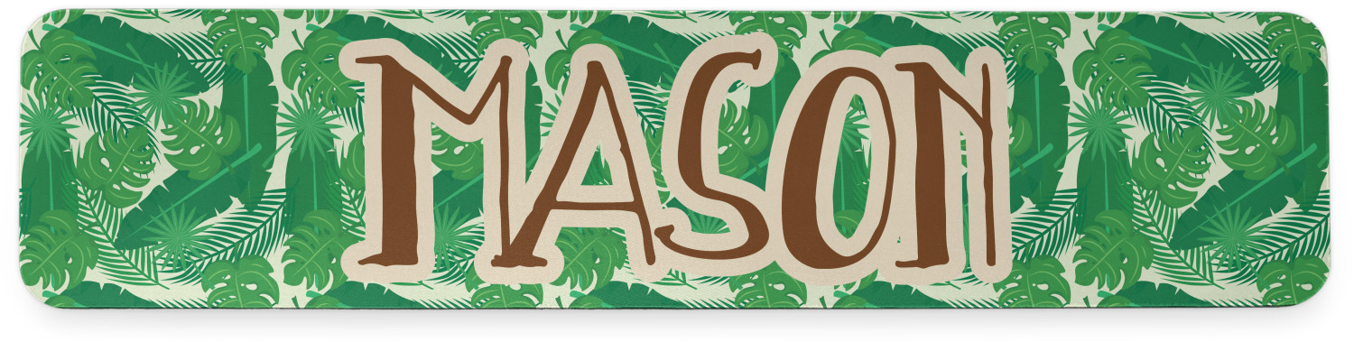 The main design has a cream background with bright green tropical leaves faces every which way. Through the middle of the design sits a cream ribbon, with your personalization on the ribbon itself. Several different kinds of tropical leaves are featured in this fun design.