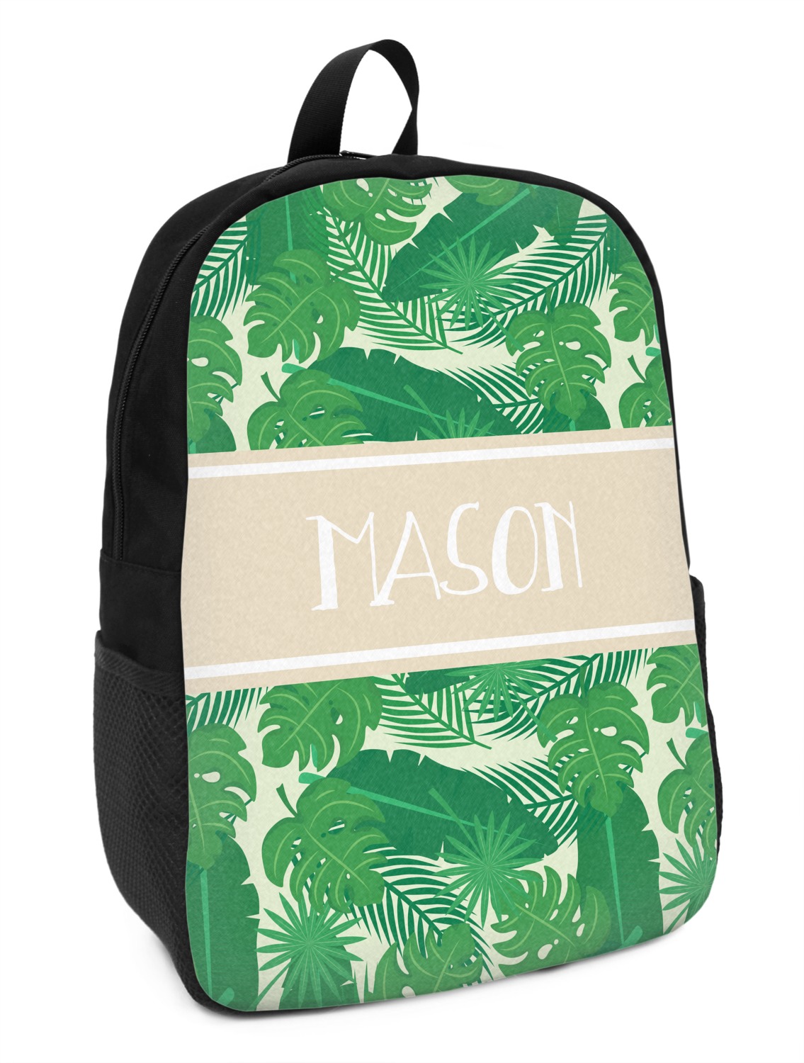 These small backpacks are made of a durable black canvas material with your personalization right on the front. The two shoulder straps are padded and easily adjustable. The bag itself measures at about 11" W x 15" H x 5" D. It's the perfect size for elementary aged kids or adults who want a smaller backpack. On the top of the bag you will find a handle to hang or carry your backpack by as well as a large zipper closure to keep all of your belongings safe inside. On each side of your backpack is a mesh pocket for a small item or water bottle. Inside your backpack you will find a spacious area with a small zipper pocket and a padded laptop slot that will fit up to a 13" laptop (13" being very snug). This is the perfect bag for any student that needs a couple books and their laptop with them at all times. It also works great as a carry on for traveling!