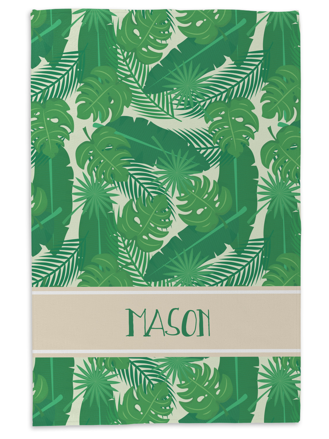 The main design has a cream background with bright green tropical leaves faces every which way. Through the middle of the design sits a cream ribbon, with your personalization on the ribbon itself. Several different kinds of tropical leaves are featured in this fun design.