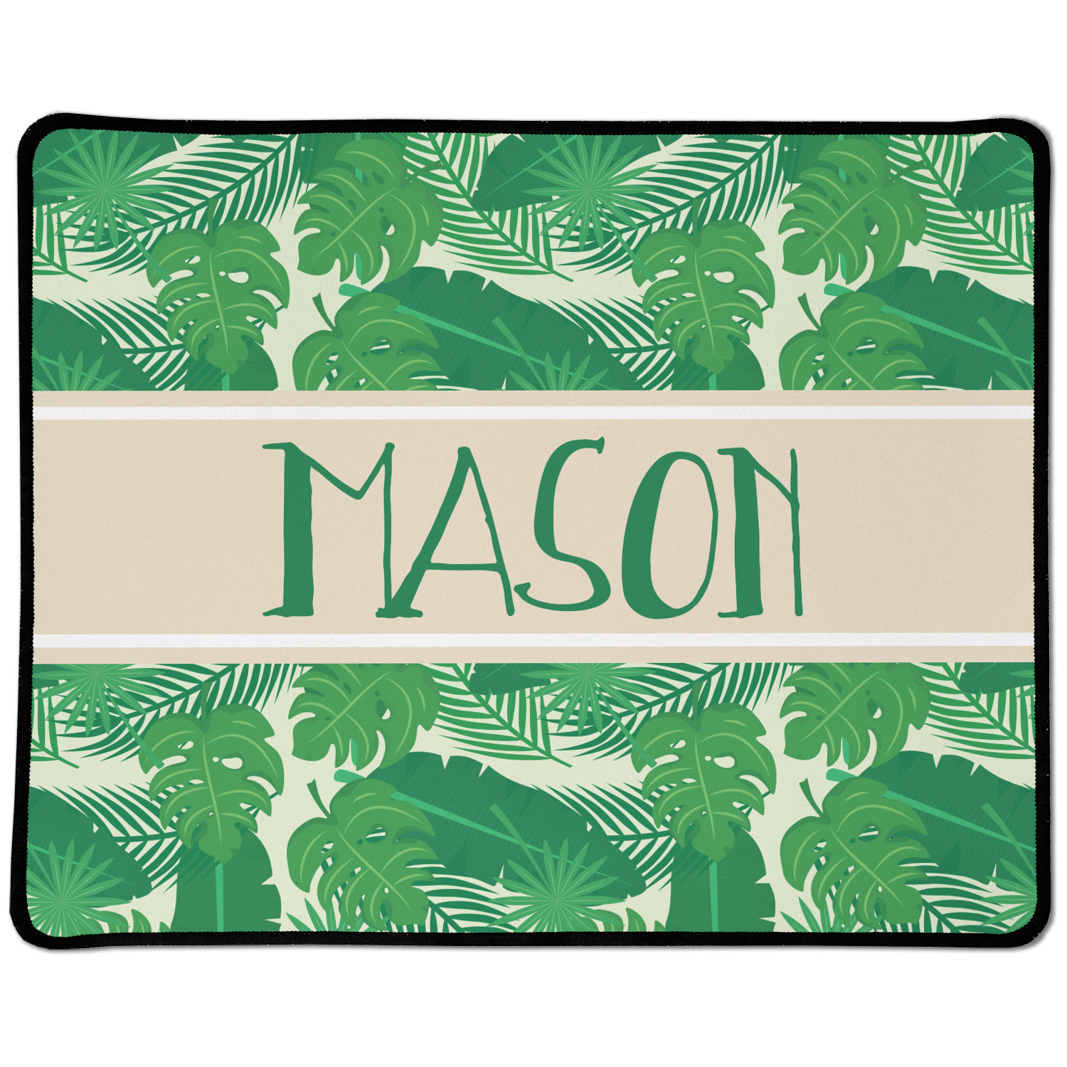The main design has a cream background with bright green tropical leaves faces every which way. Through the middle of the design sits a cream ribbon, with your personalization on the ribbon itself. Several different kinds of tropical leaves are featured in this fun design.