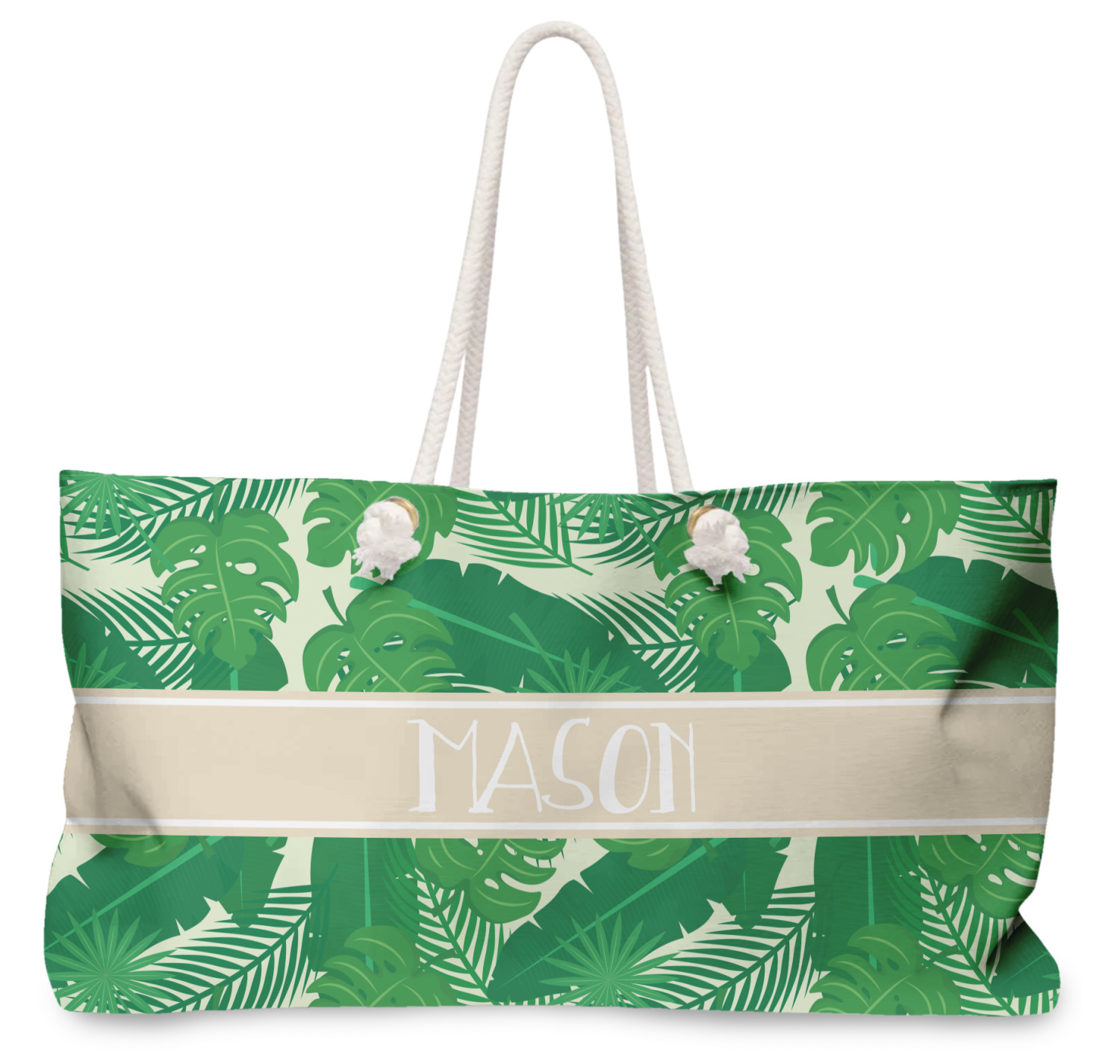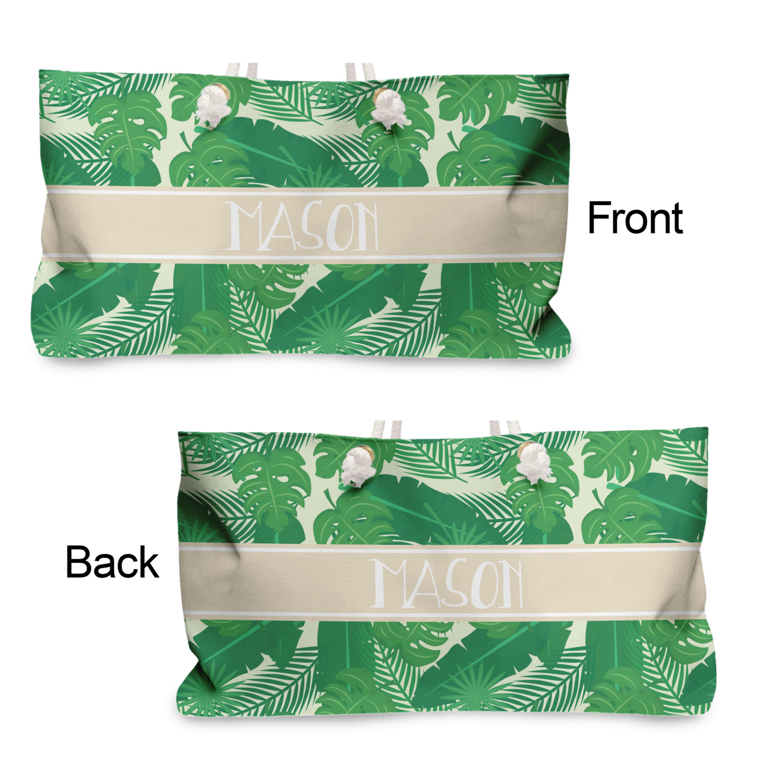 The main design has a cream background with bright green tropical leaves faces every which way. Through the middle of the design sits a cream ribbon, with your personalization on the ribbon itself. Several different kinds of tropical leaves are featured in this fun design.